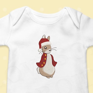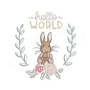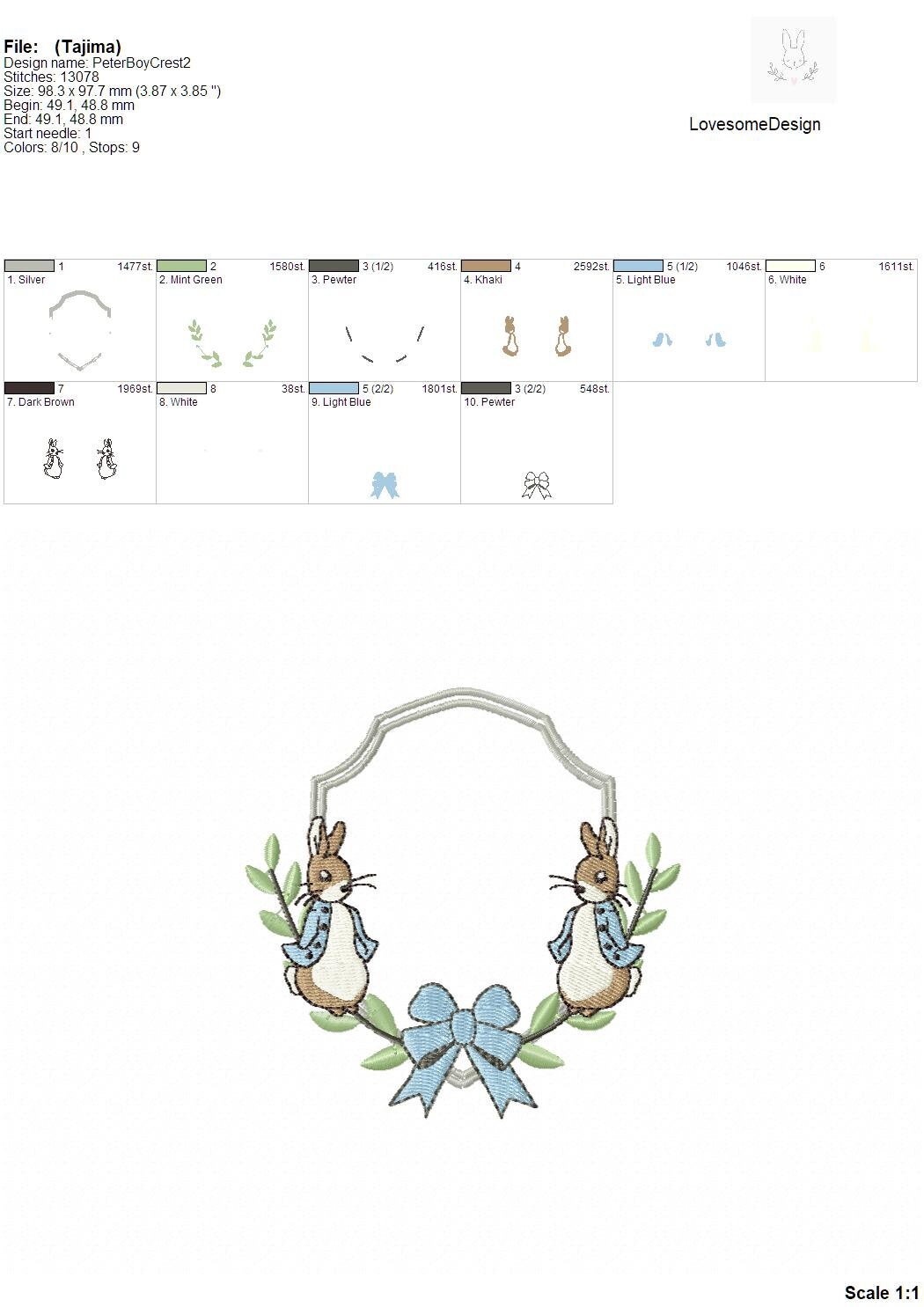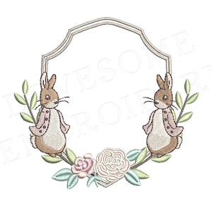 This listing features a machine embroidery file of Peter Rabbit bow crest design in 4 inch size.