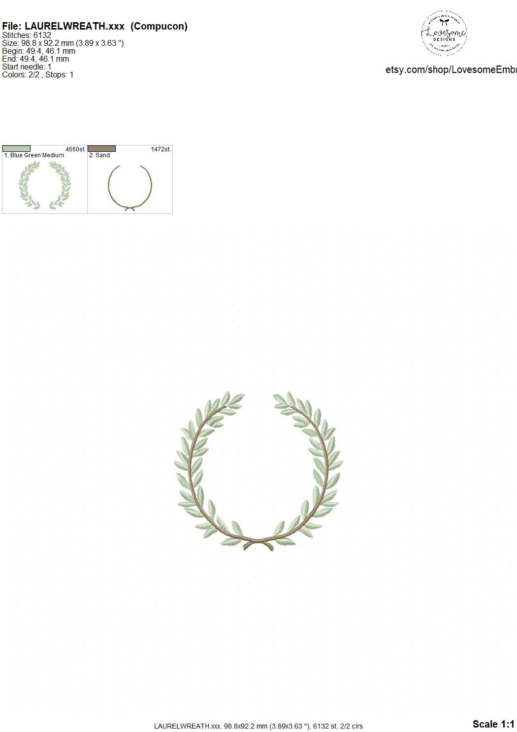 This listing features a machine embroidery file of laurel wreath design in 4 inch size.