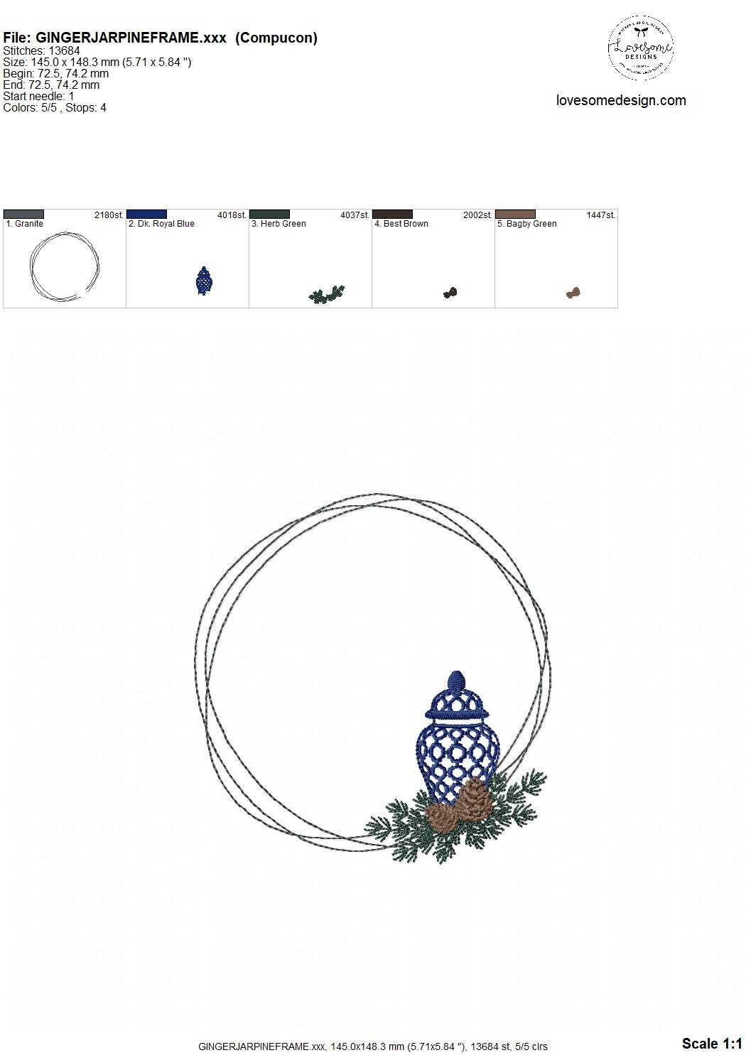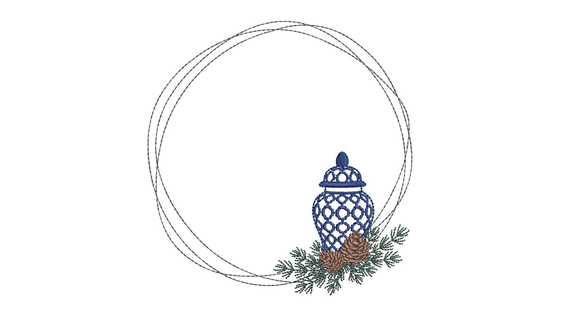 This listing features a machine embroidery file of ginger jar with pinecones wreath design in 6 inch size.