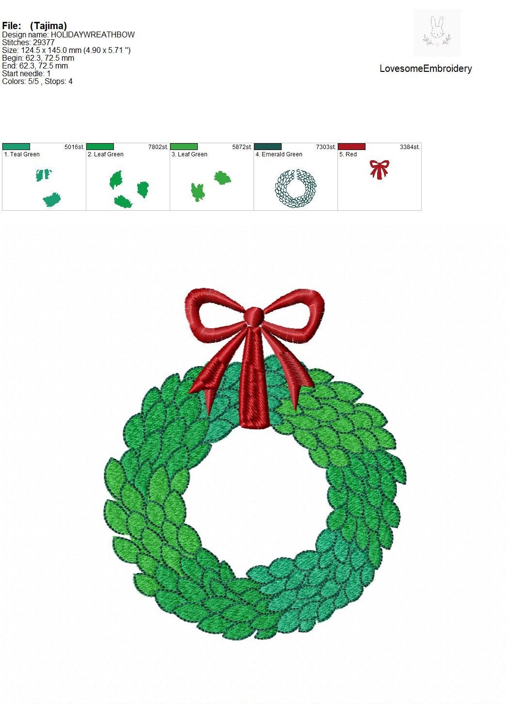 This listing features a machine embroidery file of holiday wreath hanging with a bow ribbon design in 6inch size.