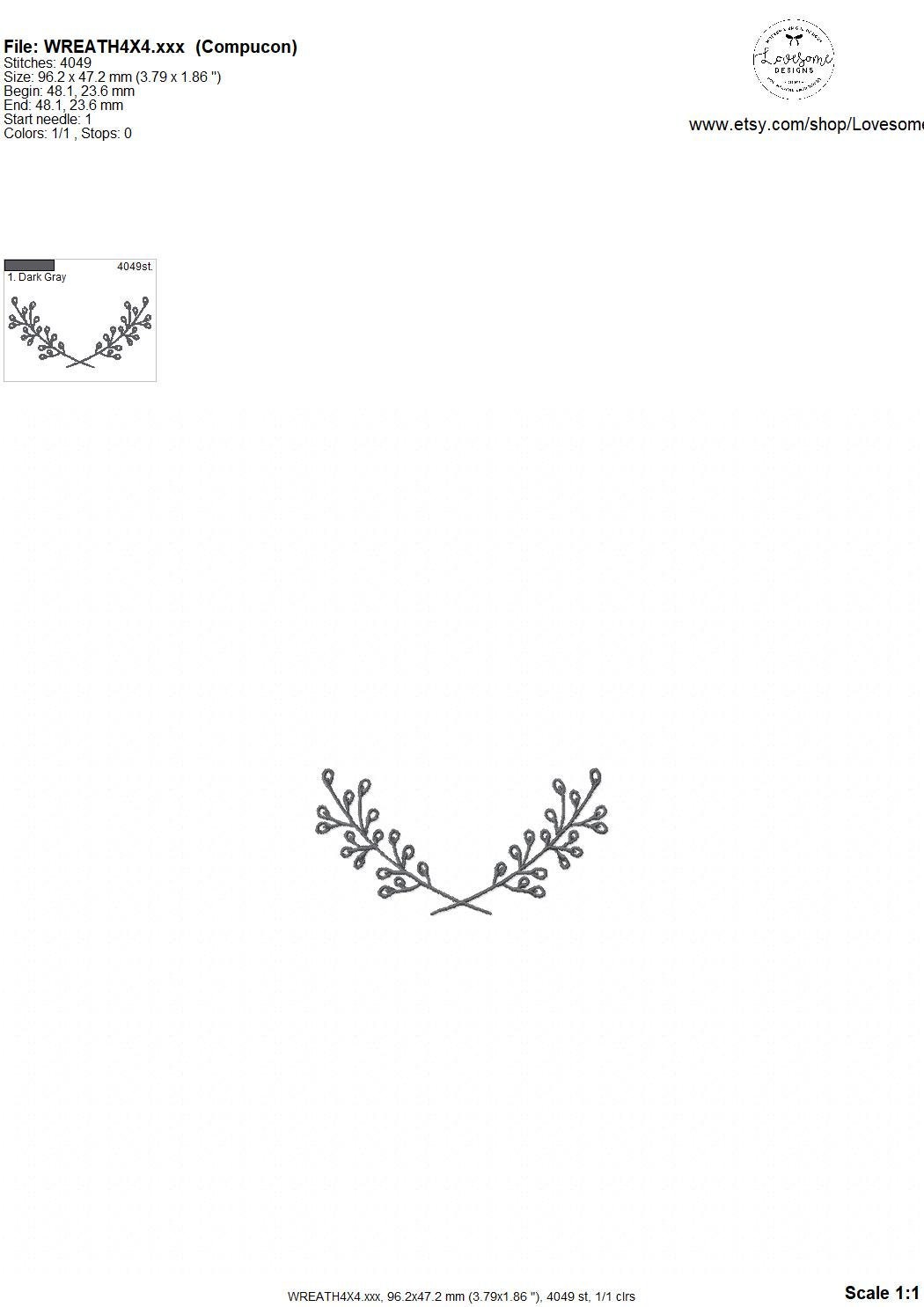 This listing features a machine embroidery file of a dainty branch wreath design in 4 inch size.