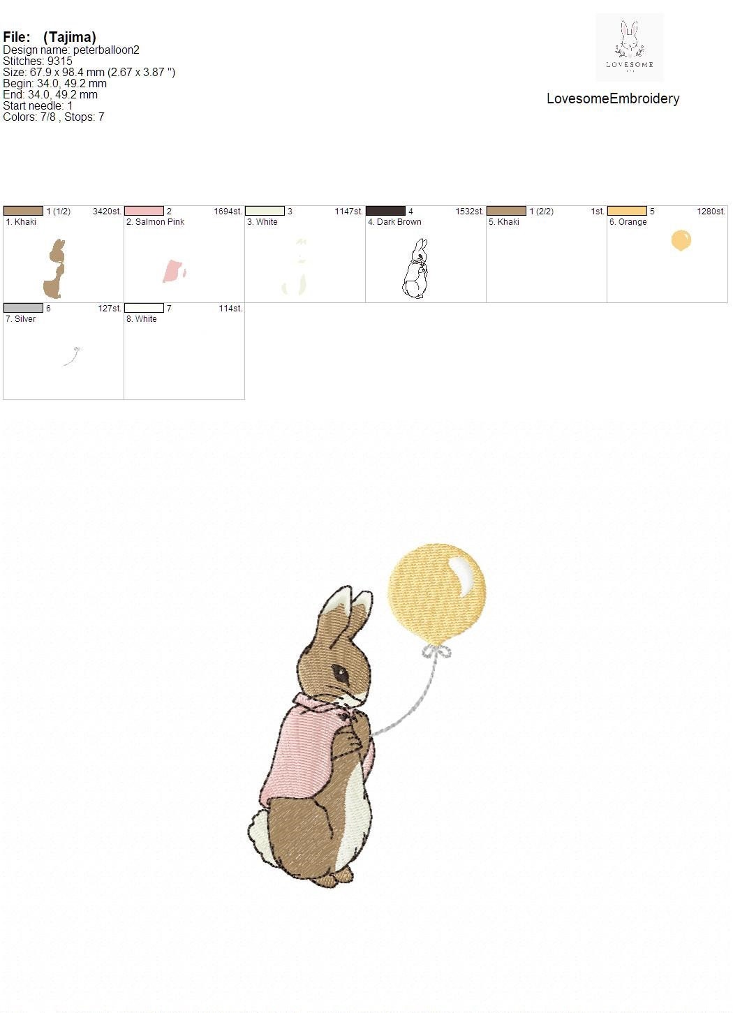 This listing features a machine embroidery file of Cottontail Rabbit holding a balloon in hand in 4inch size. Designed with love for the birthday of the little one.