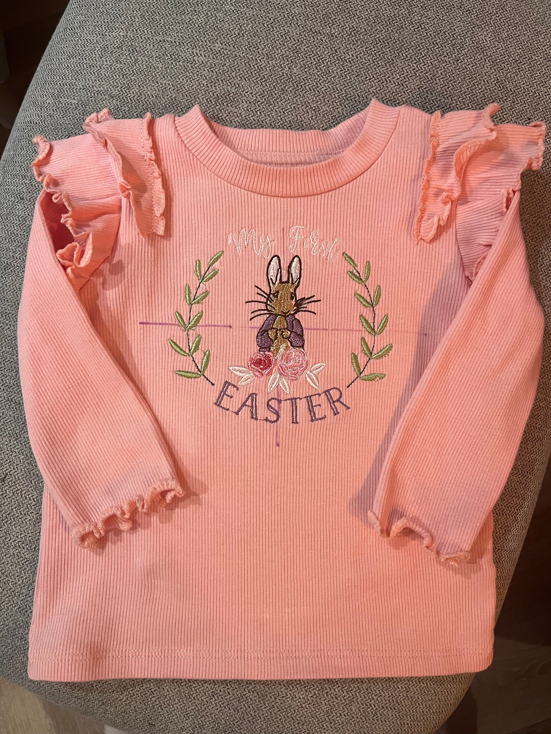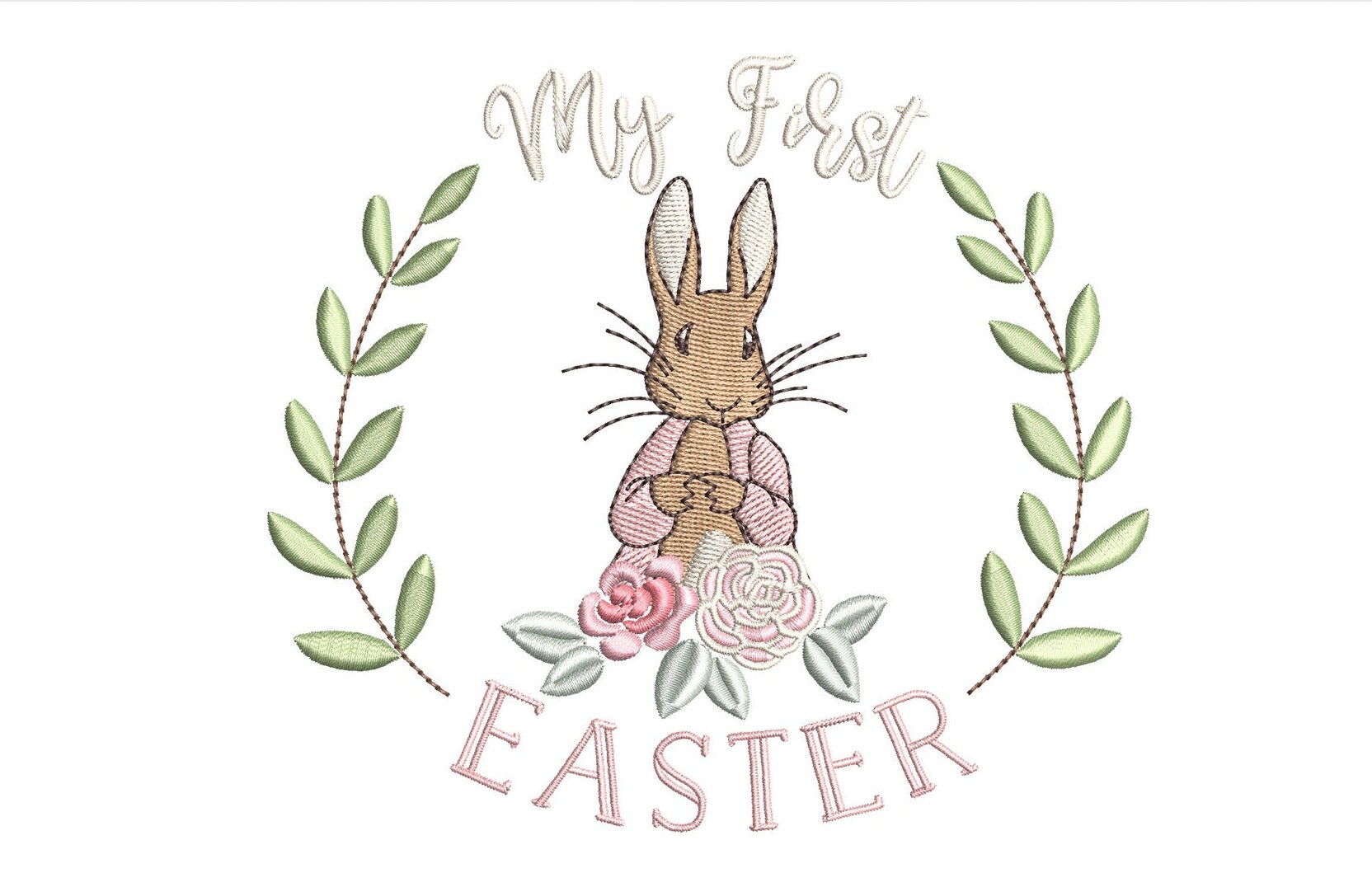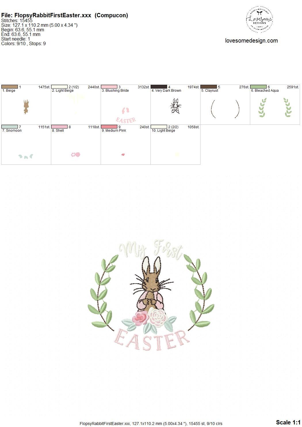 This listing features two machine embroidery files of Flopsy Rabbit, one "Happy Easter" and one "First Easter" design in 5 inch size.