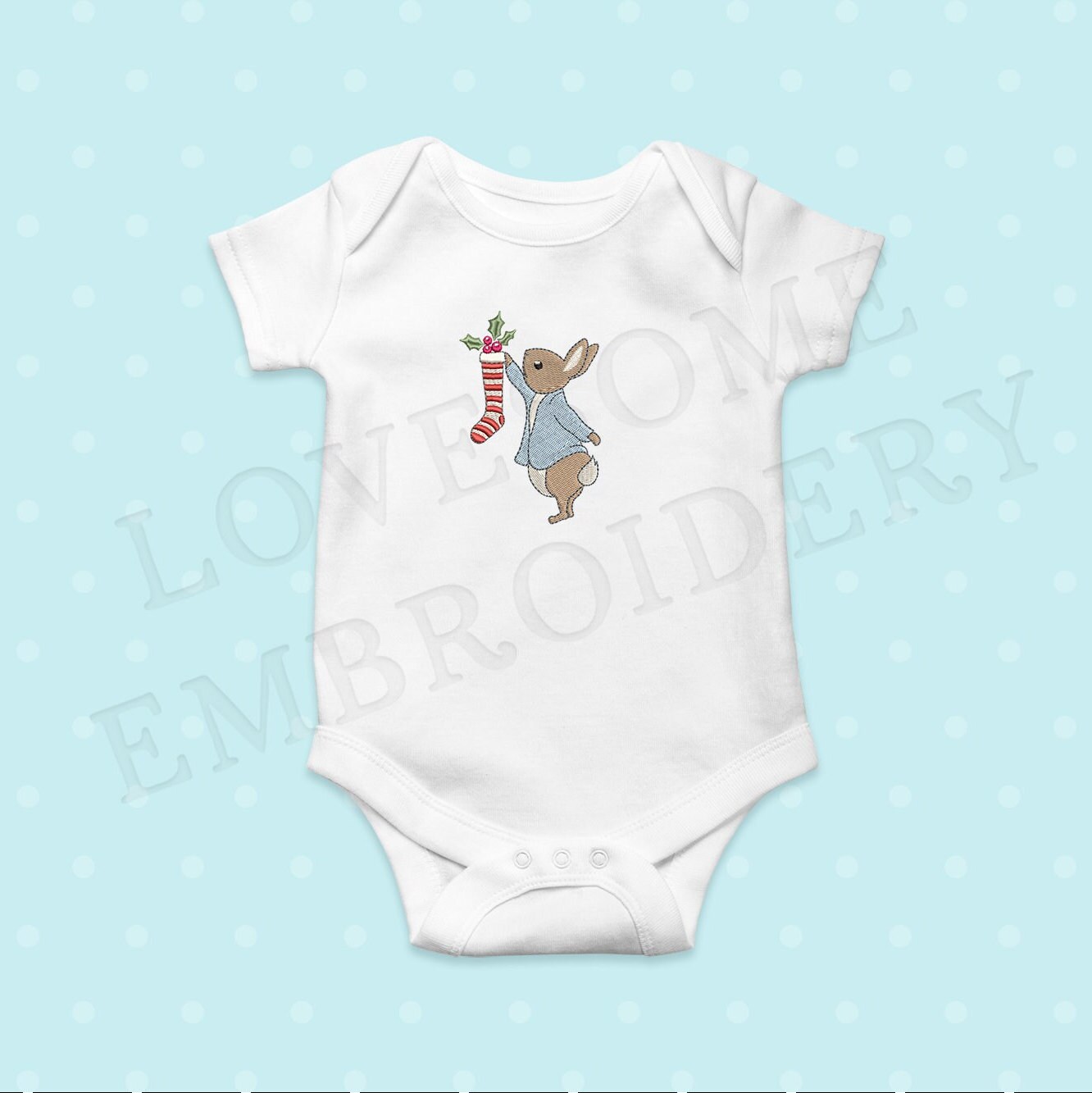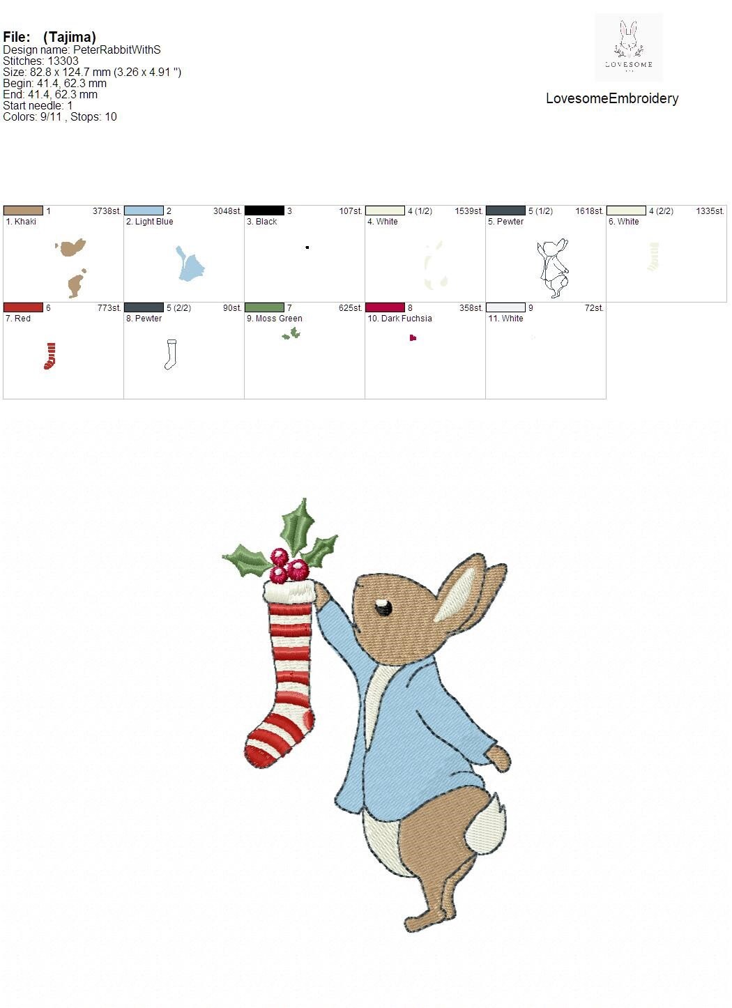 Christmas Sock 5inch Peter Rabbit Embroidery Design, Cute Bunny with Holiday Stocking Machine Embroidery File, for holiday themed Peter Rabbit cuteness on your newborns holiday blanket or apparel.