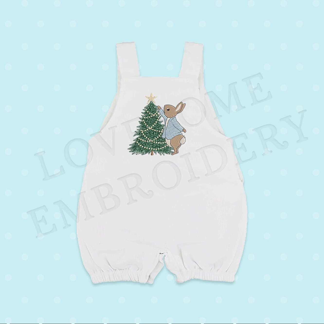 Christmas Tree 5inch Peter Rabbit Embroidery Design, Cute Bunny decorating the Holiday Tree Machine Embroidery File for holiday themed Peter Rabbit cuteness on your newborns holiday blanket or apparel.
