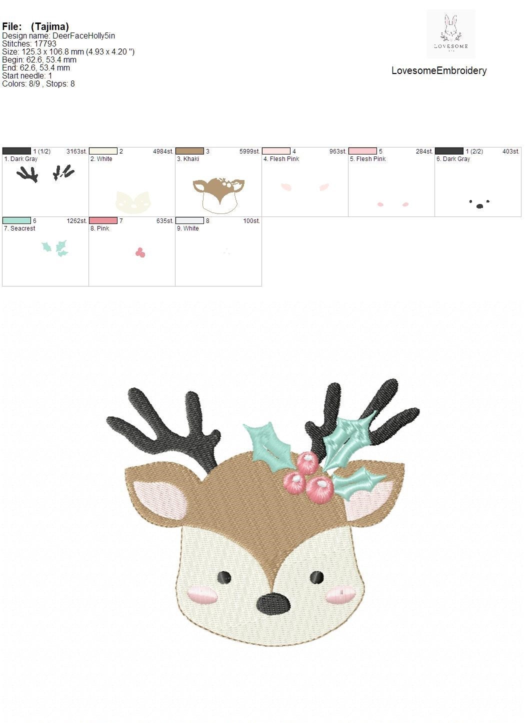 This listing features a machine embroidery file of a cute baby deer face with a holly on his head design in 5 inch size.