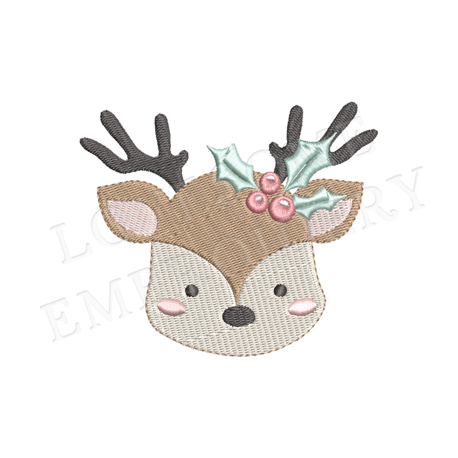 Baby Deer with Holly 5inch Embroidery Design, Cute Reindeer Face Embroidery File, Christmas Deer for Kids | Lovesome Embroidery