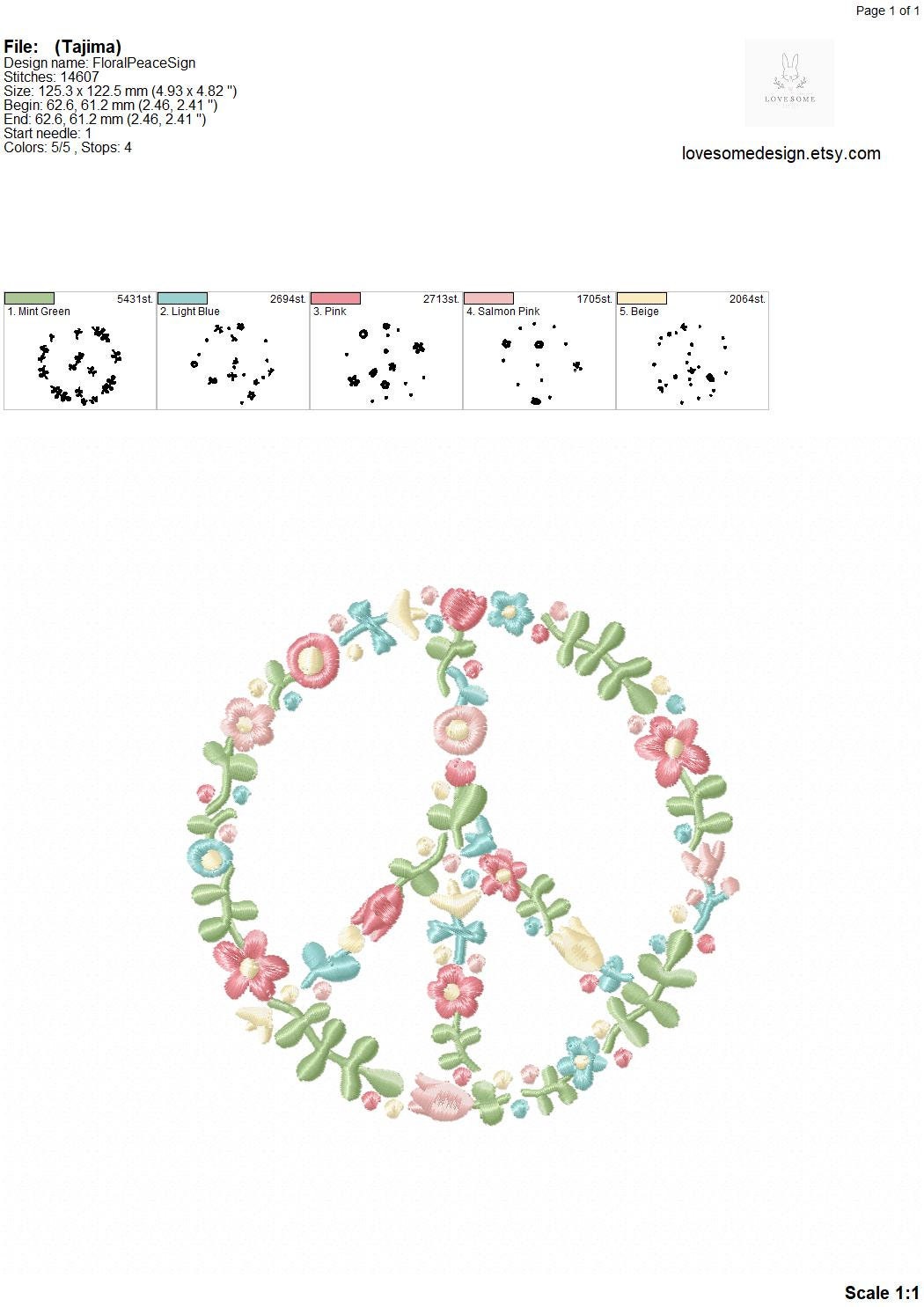 This listing features a machine embroidery file of floral fill peace sign in 5 inch size.