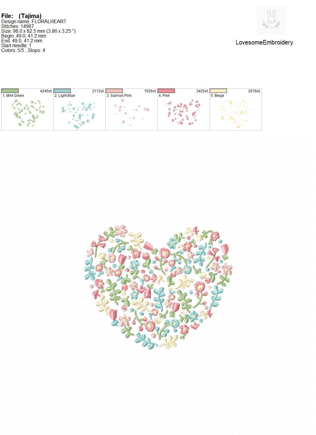 This listing features a machine embroidery file of floral fill heart in 4 inch size.