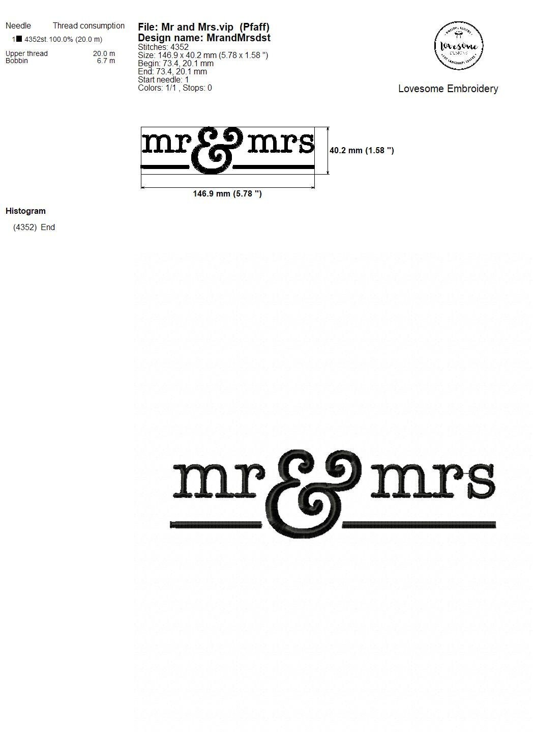 This listing features a machine embroidery file of "Mr & Mrs" with an elegant style in 6inch size.