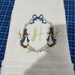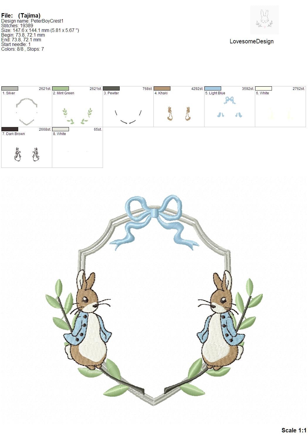 This listing features a machine embroidery file of Peter Rabbit bow crest design in 6 inch size.