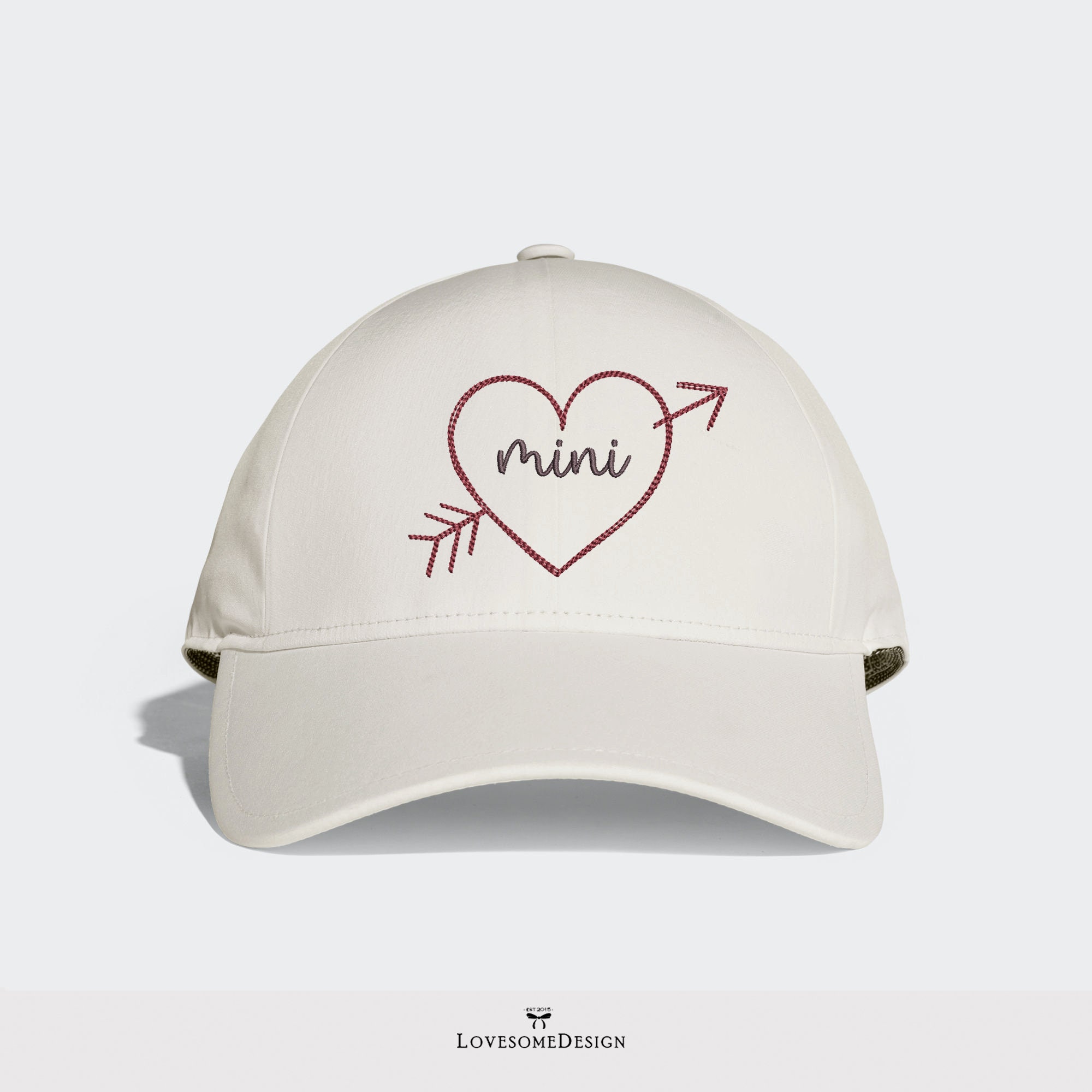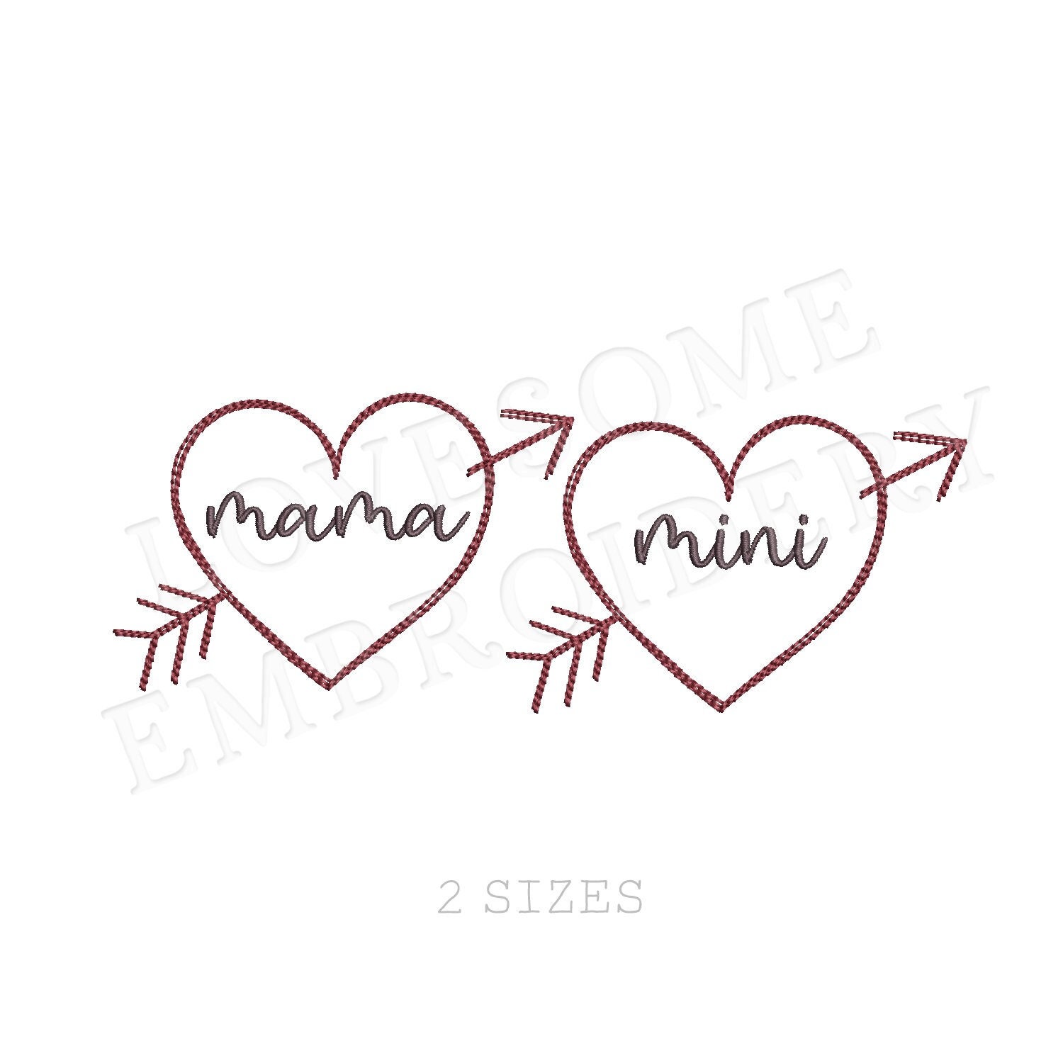 This listing features a machine embroidery file of word "mama" and "mini" in a cute heart design in two sizes.
