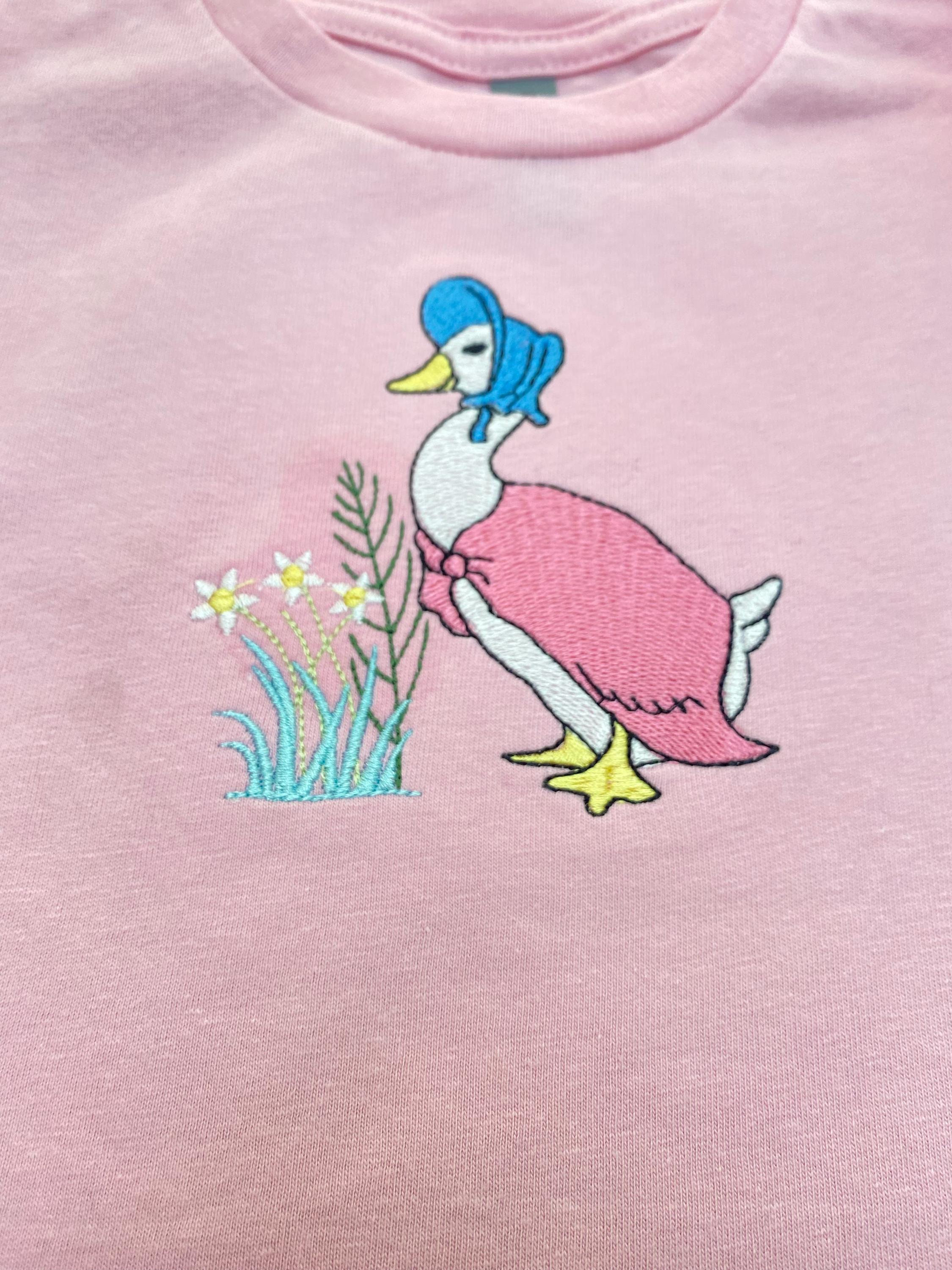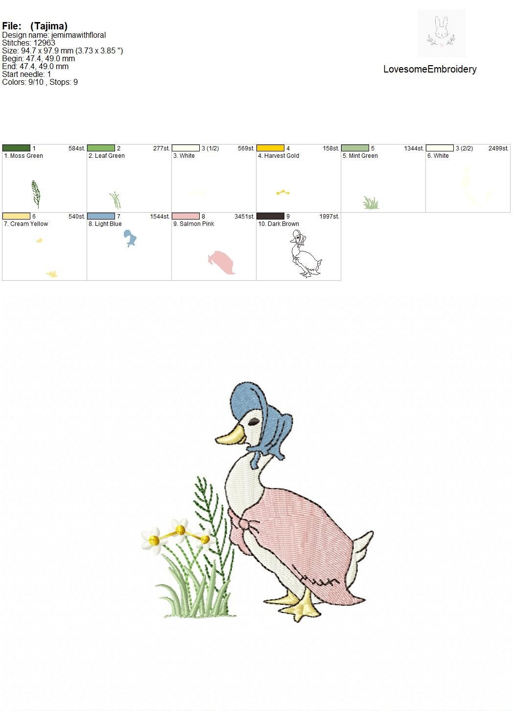 This listing features a machine embroidery file of Jemima Puddleduck with meadow florals design in 4 inch size.