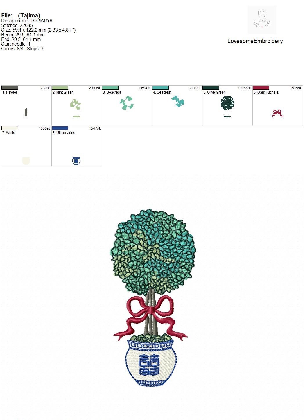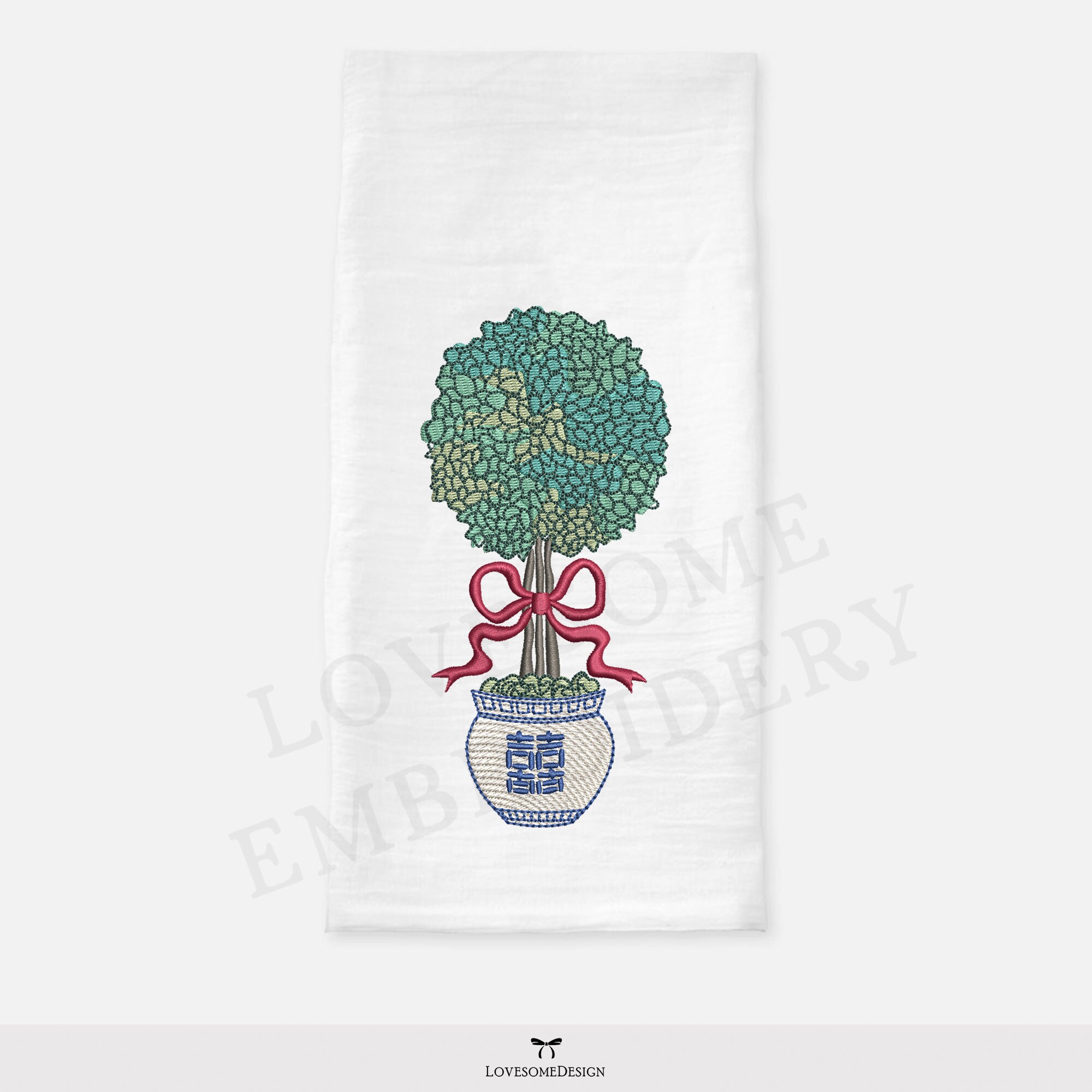 Chinoiserie Topiary 5inch Embroidery Design, Chinoiserie Chic Topiary in a Pot with Bow Digital Download | Lovesome Design