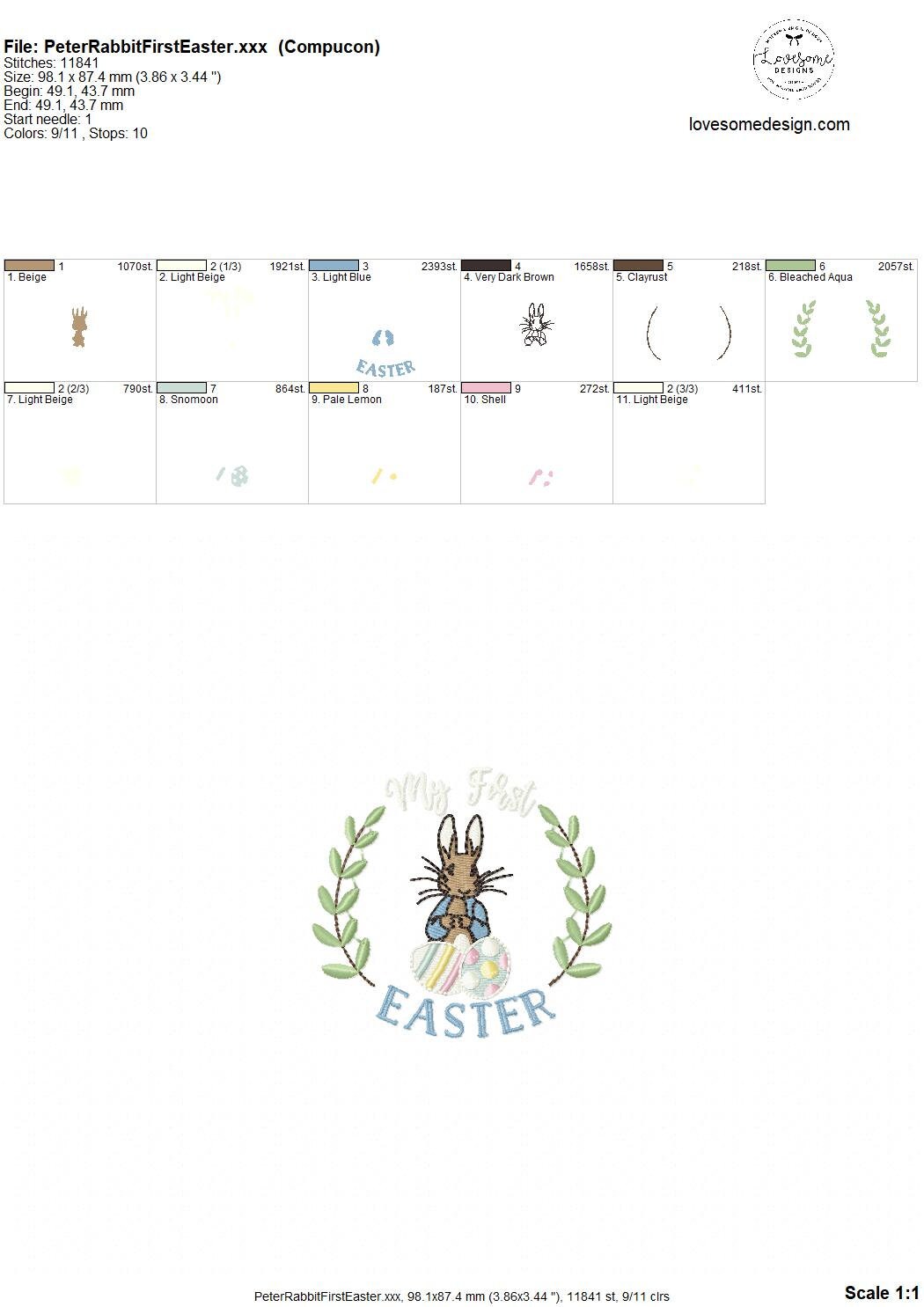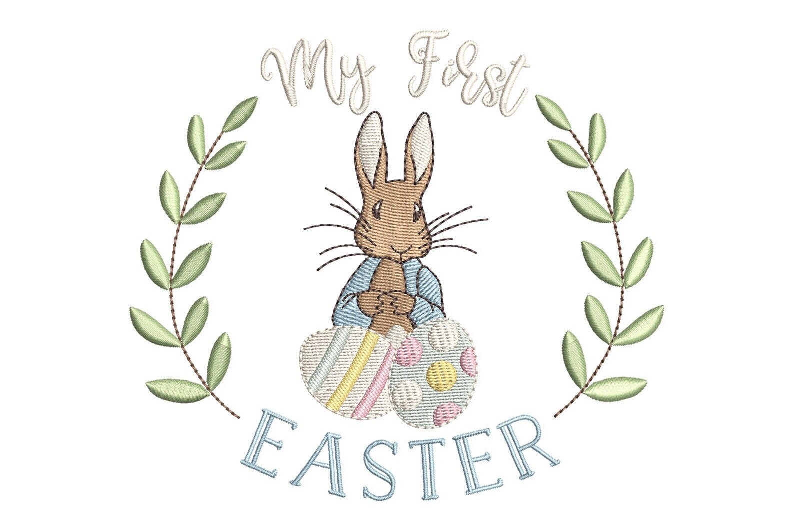 This listing features two machine embroidery files of Peter Rabbit, one "Happy Easter" and one "First Easter" design in 4 inch size.