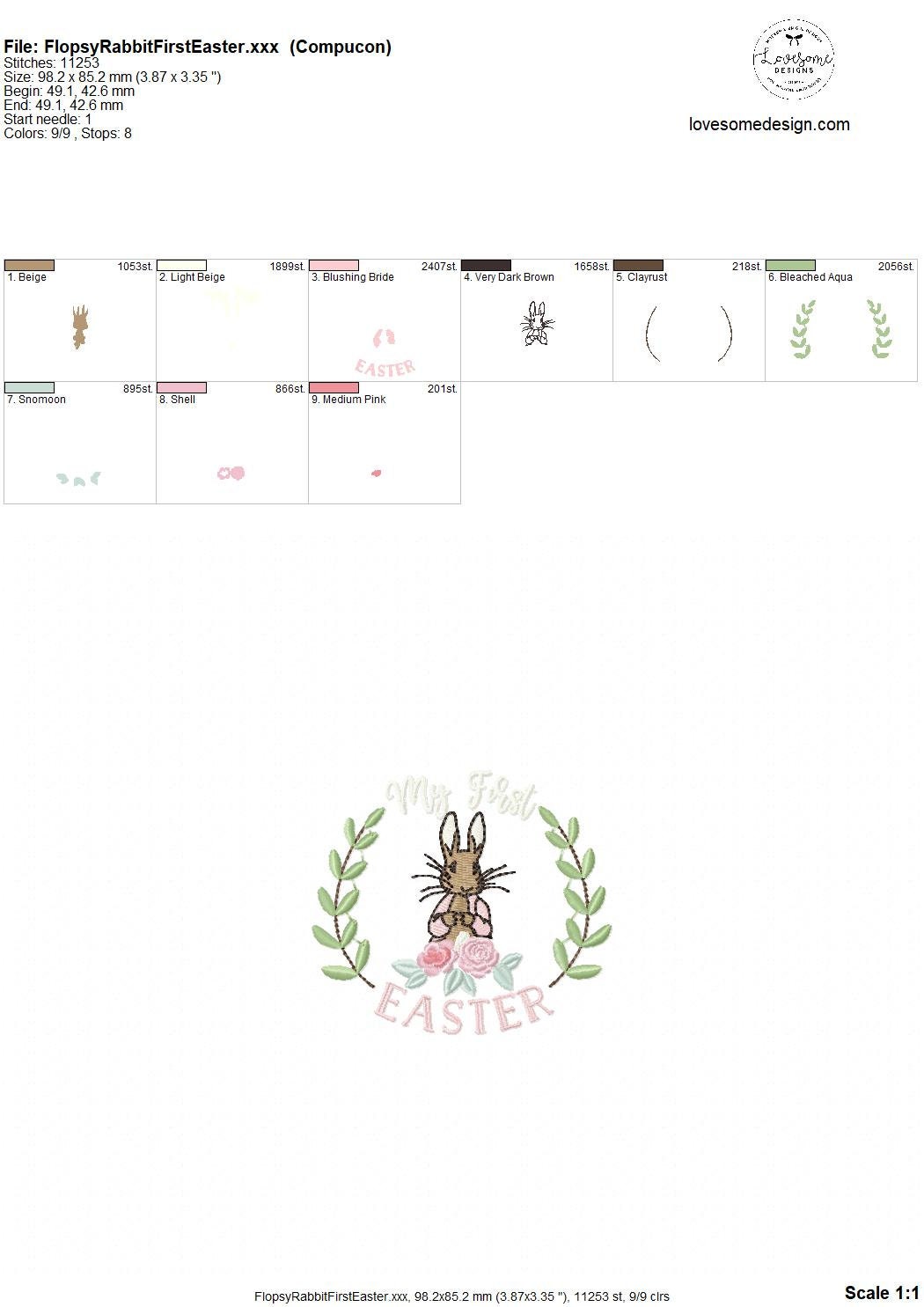 This listing features two machine embroidery files of Flopsy Rabbit, one "Happy Easter" and one "First Easter" design in 4 inch size.