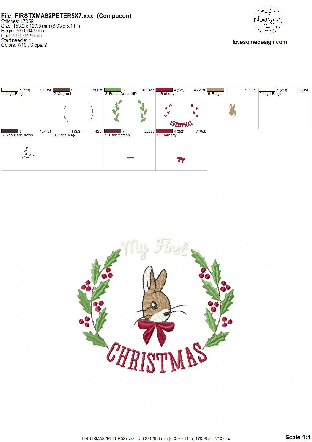 Babys First Christmas 5inch Peter Rabbit Embroidery Design, My First Xmas Rabbit with Red Bow and Holy Berries Wreath | Lovesome Embroidery