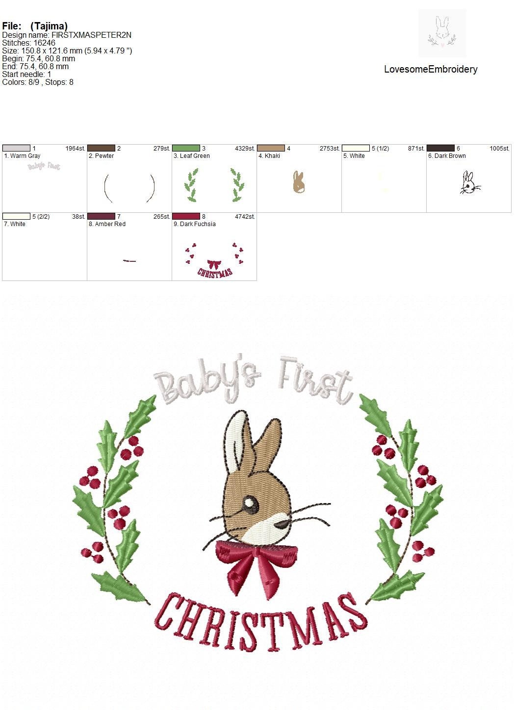 This listing features two machine embroidery files of Peter Rabbit, one "Babys First Christmas" and one "My First Christmas" design in 5 inch size.