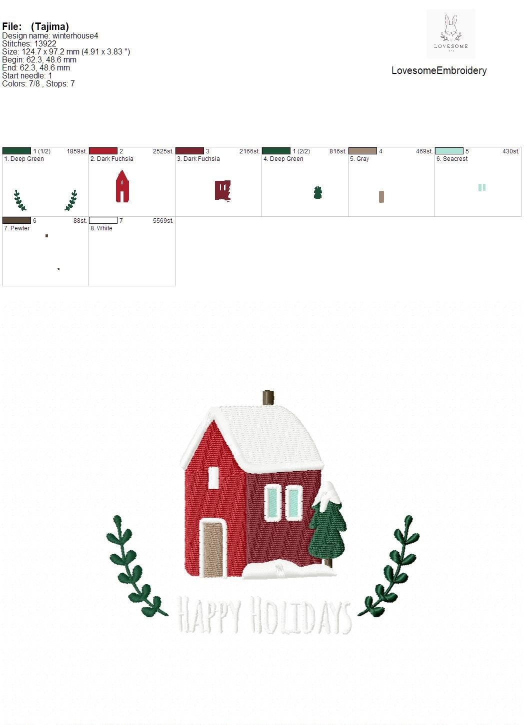 This listing features a machine embroidery design file of a red winter cottage with a wreath underneath and the lettering which says "Happy Holidays" in 5inch size.