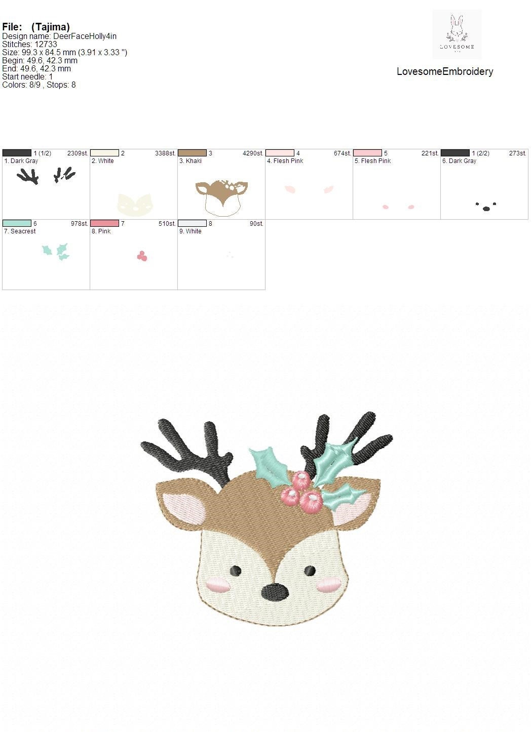 This listing features a machine embroidery file of a cute baby deer face with a holly on his head design in 4 inch size.