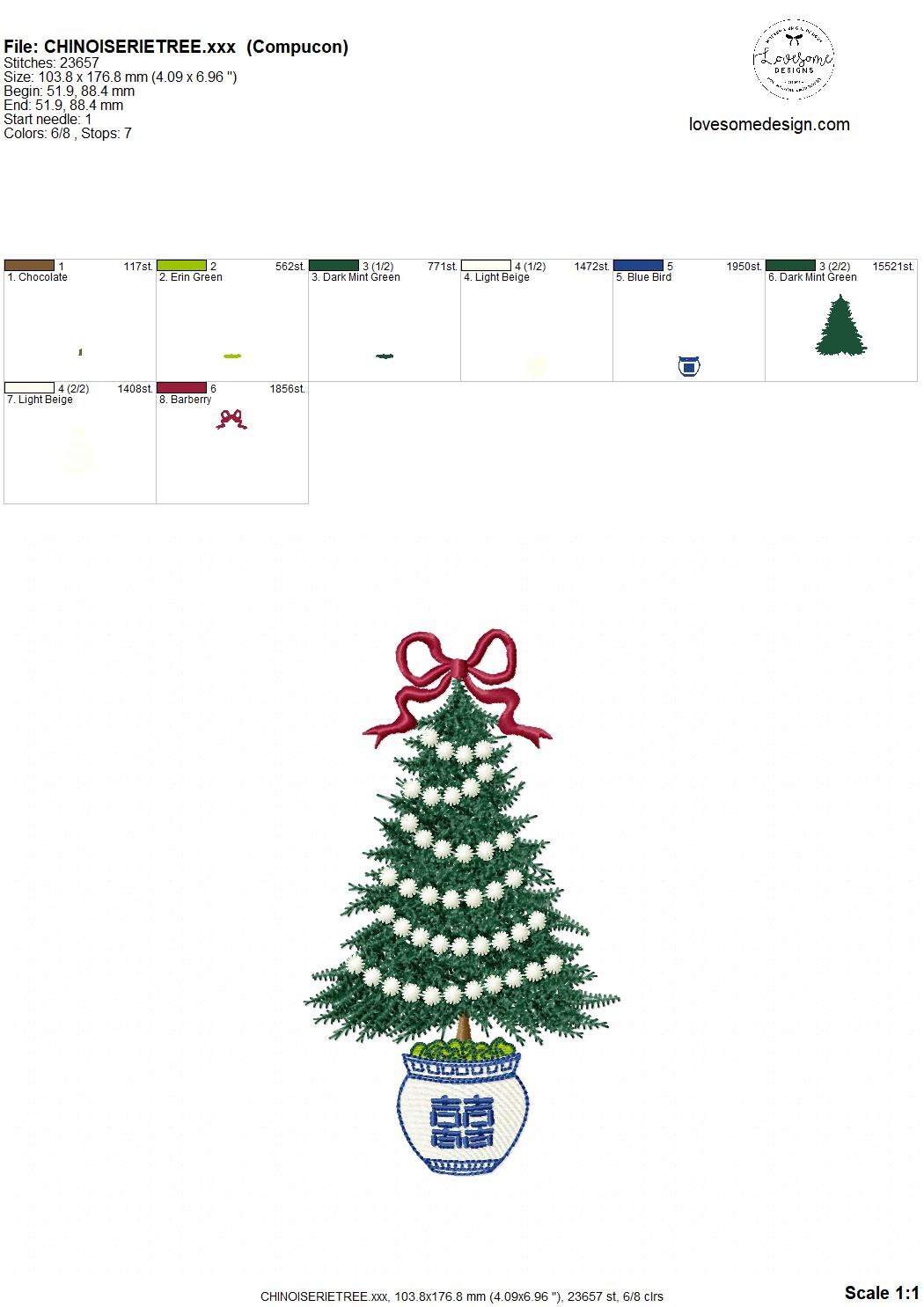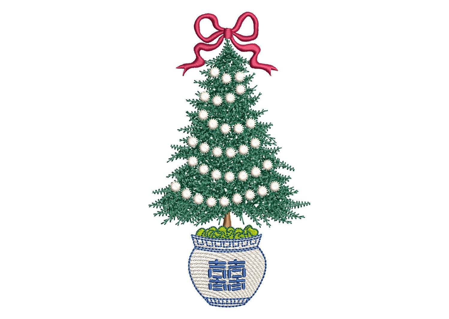 This listing features a machine embroidery file of Chinoiserie Chic Holiday Tree with Red Bow in a Chinoisery Blue and White Planter design in 7 inch size.