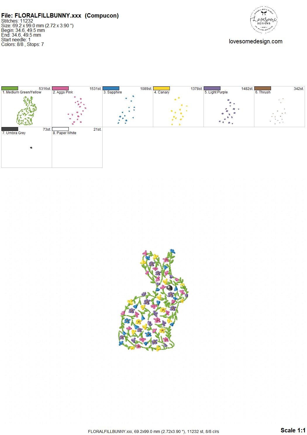 This listing features a machine embroidery file of floral fill rabbit in 4 inch size.