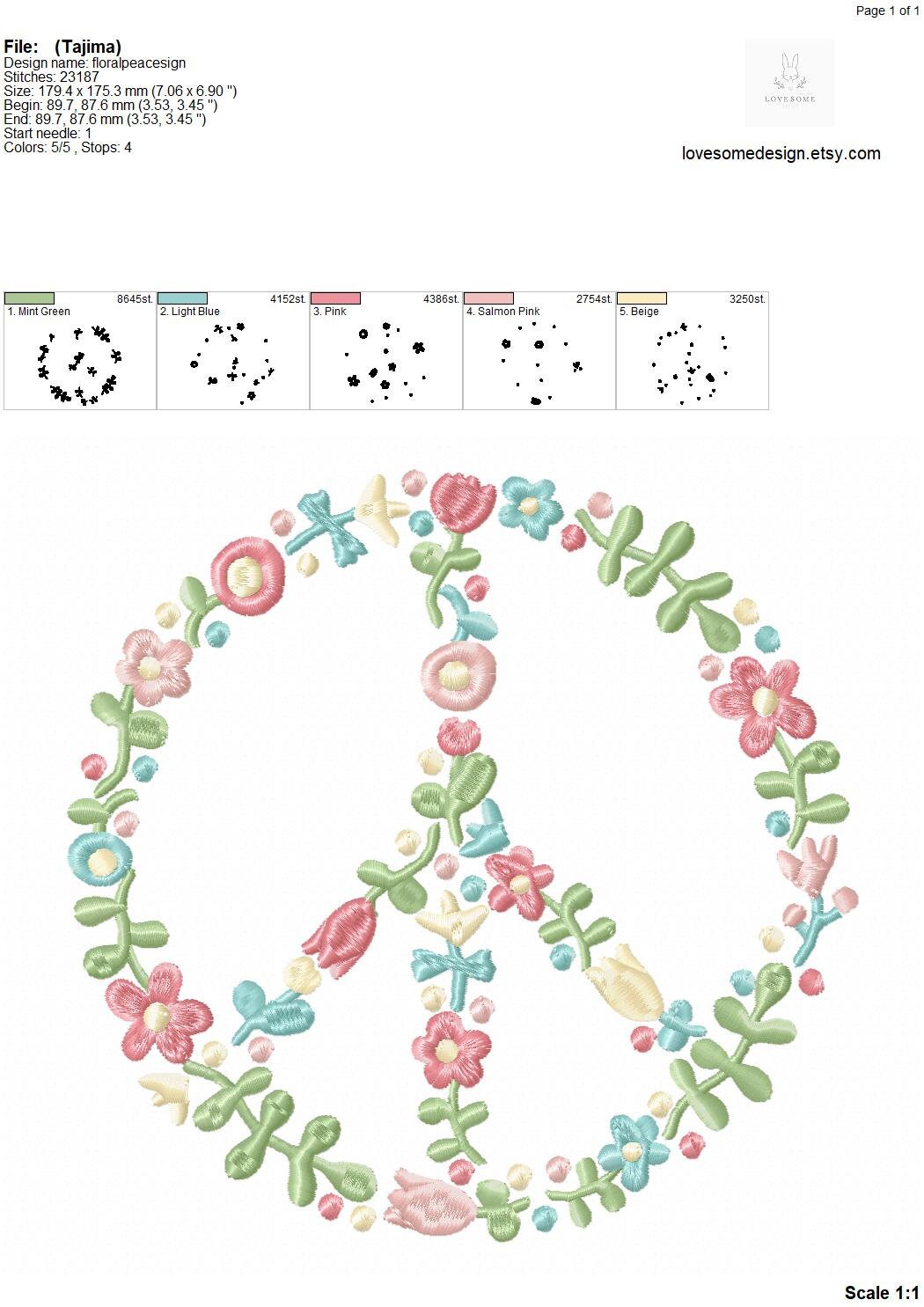 This listing features a machine embroidery file of floral fill peace sign in 8 inch size.