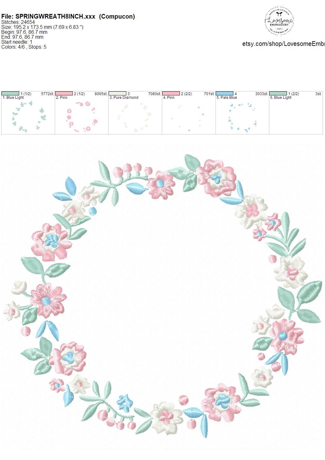 This listing features a machine embroidery file of a beautiful floral wreath in 8inch size with elegant pastel colors.