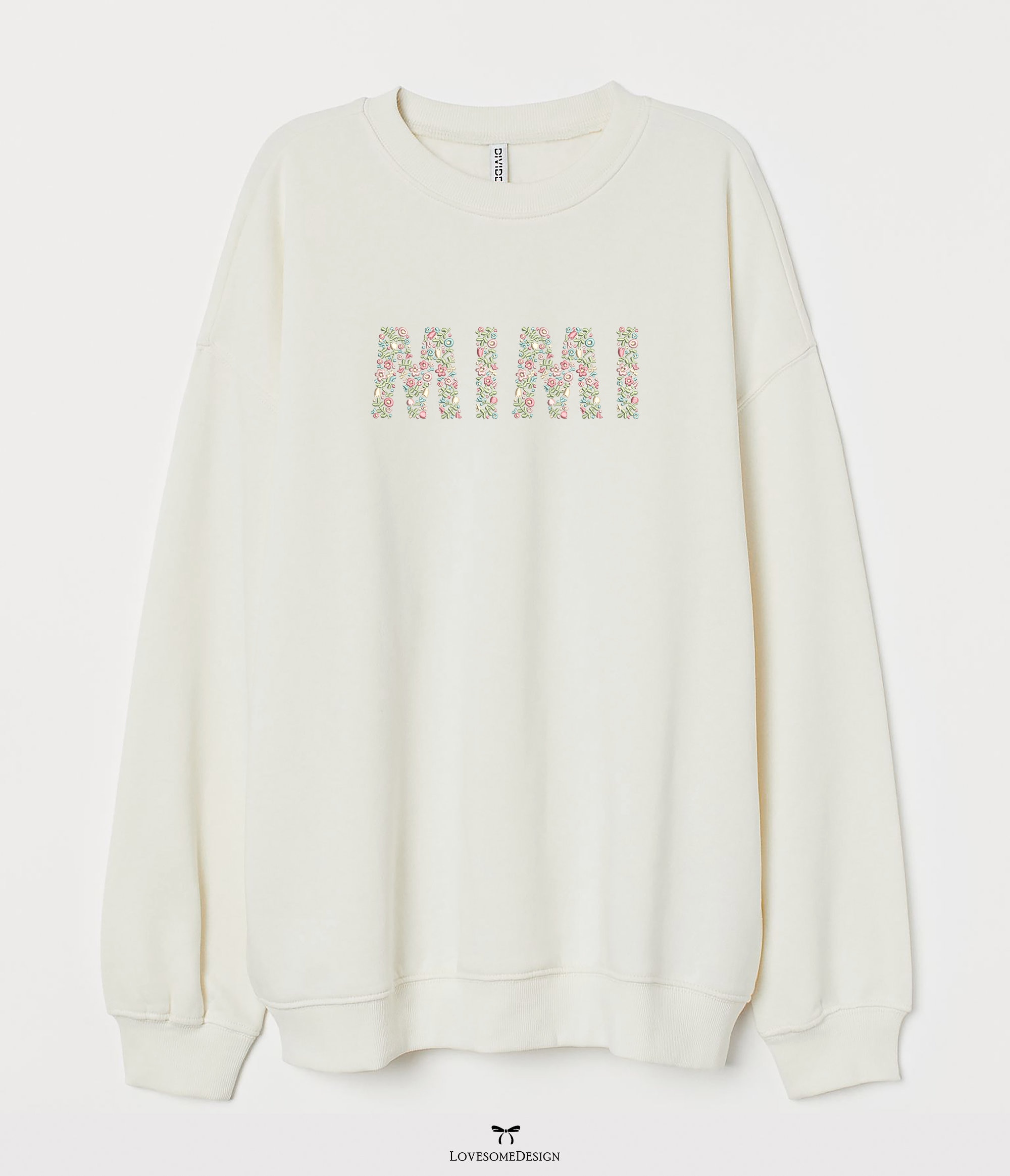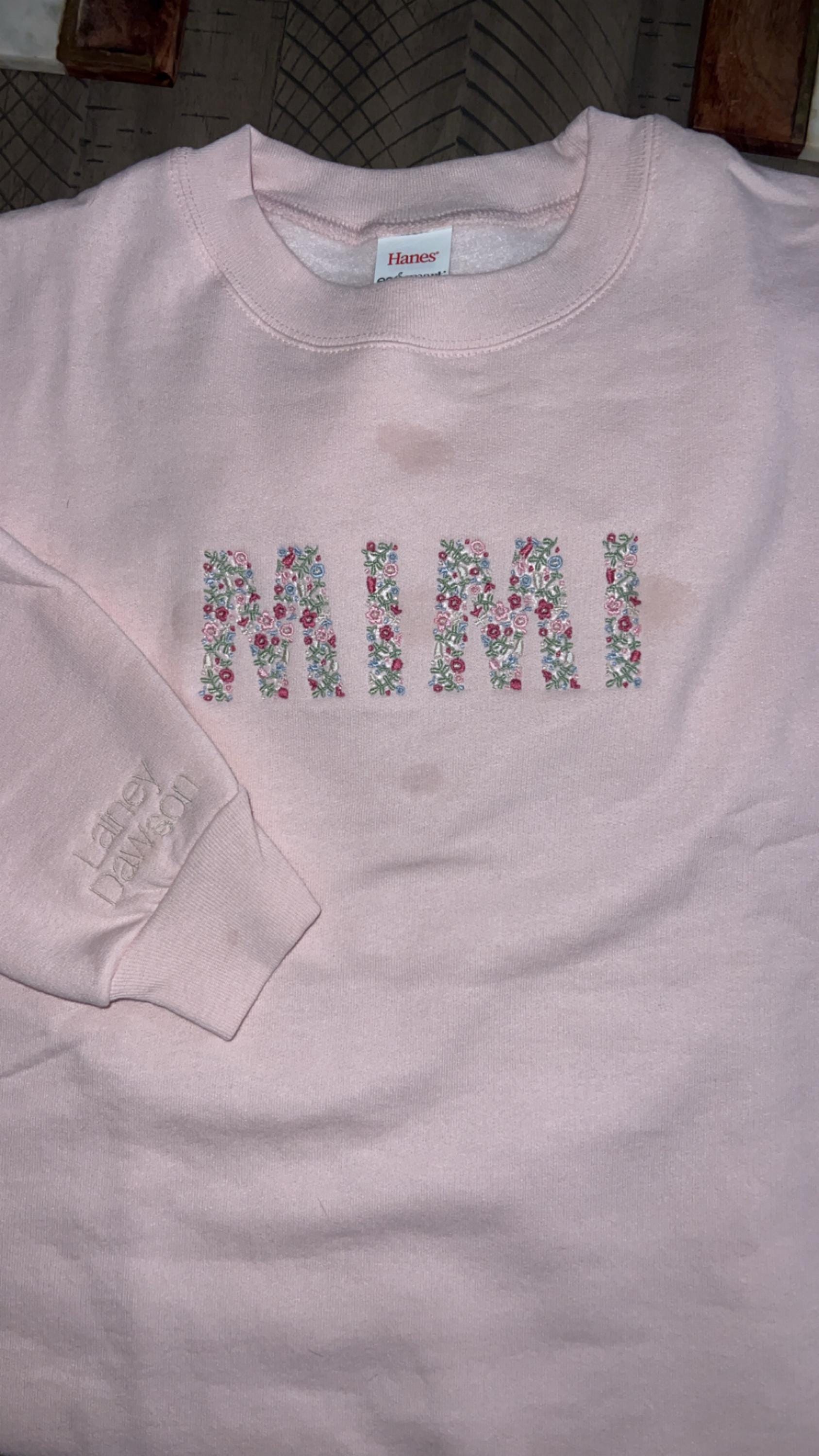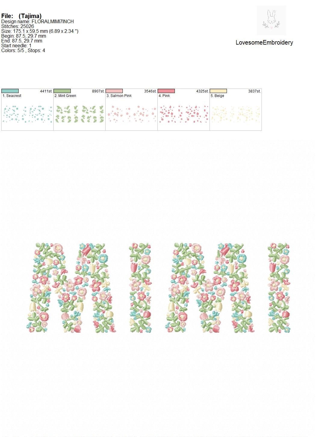 This listing features a machine embroidery file of word "MIMI" which has a beautiful dainty floral fill design with pastel spring colors in 7inch size.
