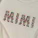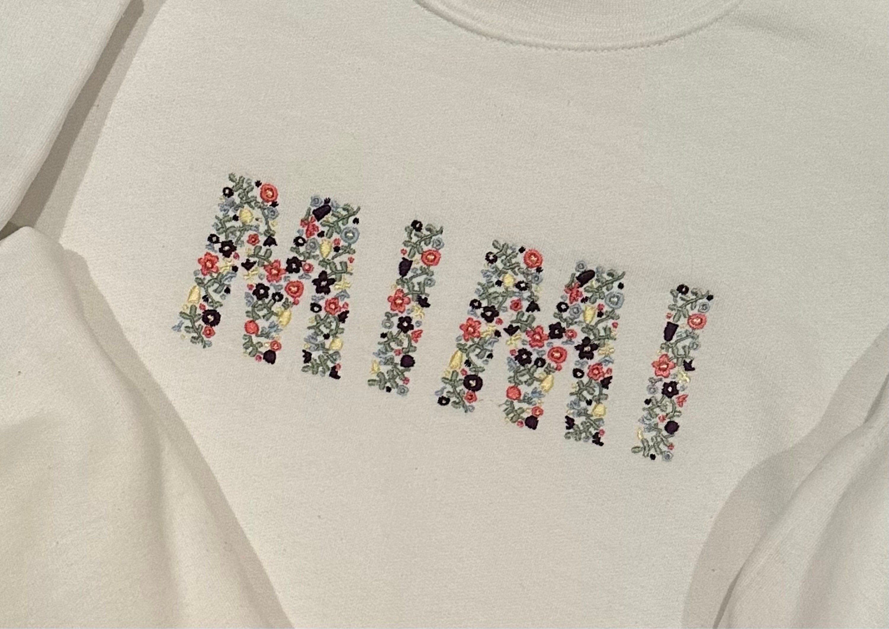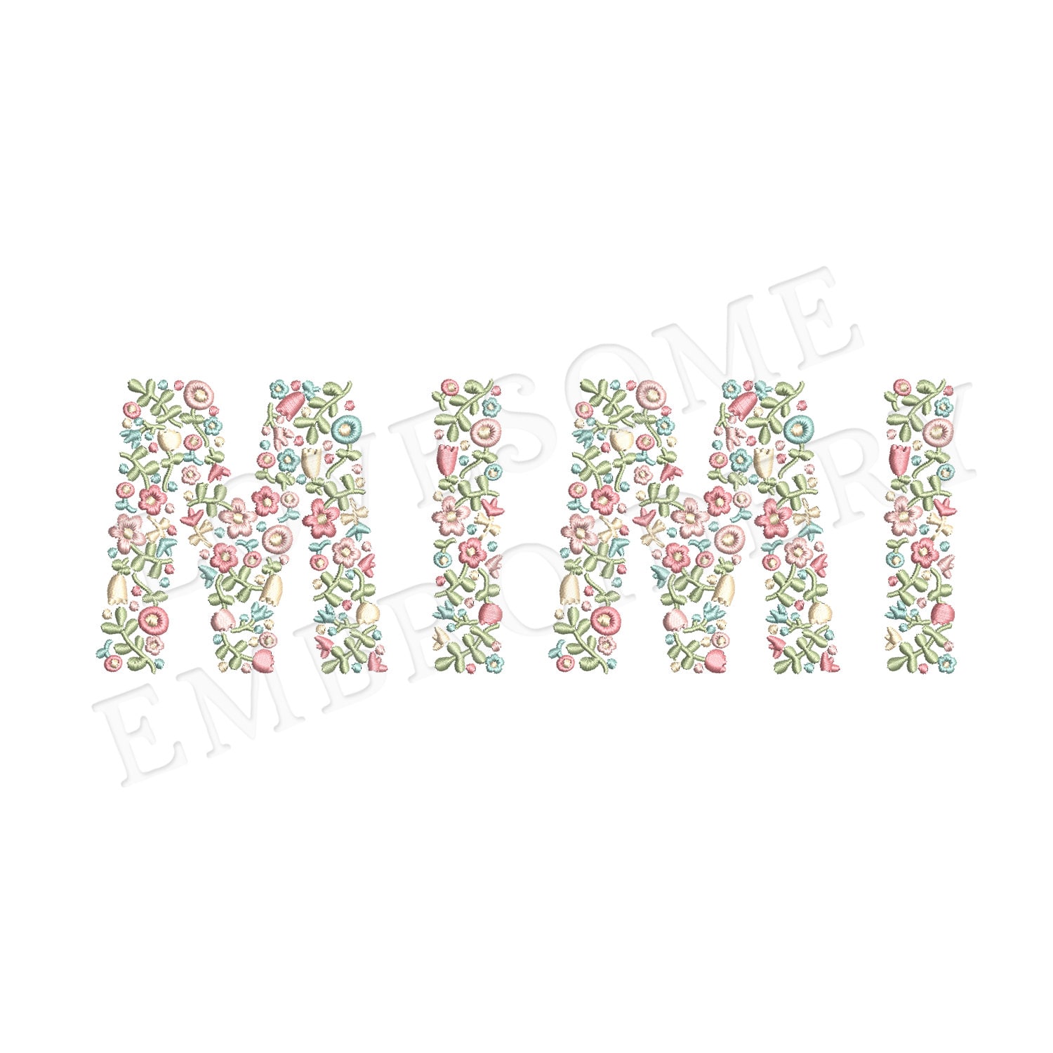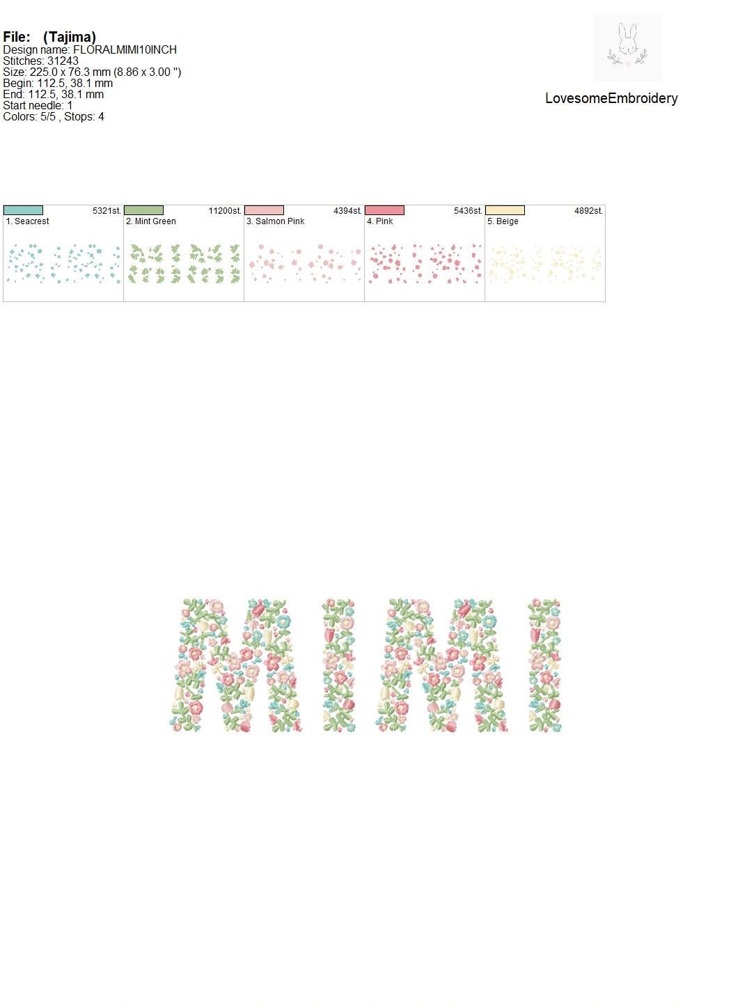 This listing features a machine embroidery file of word "MIMI" which has a beautiful dainty floral fill design with pastel spring colors in 10inch size.