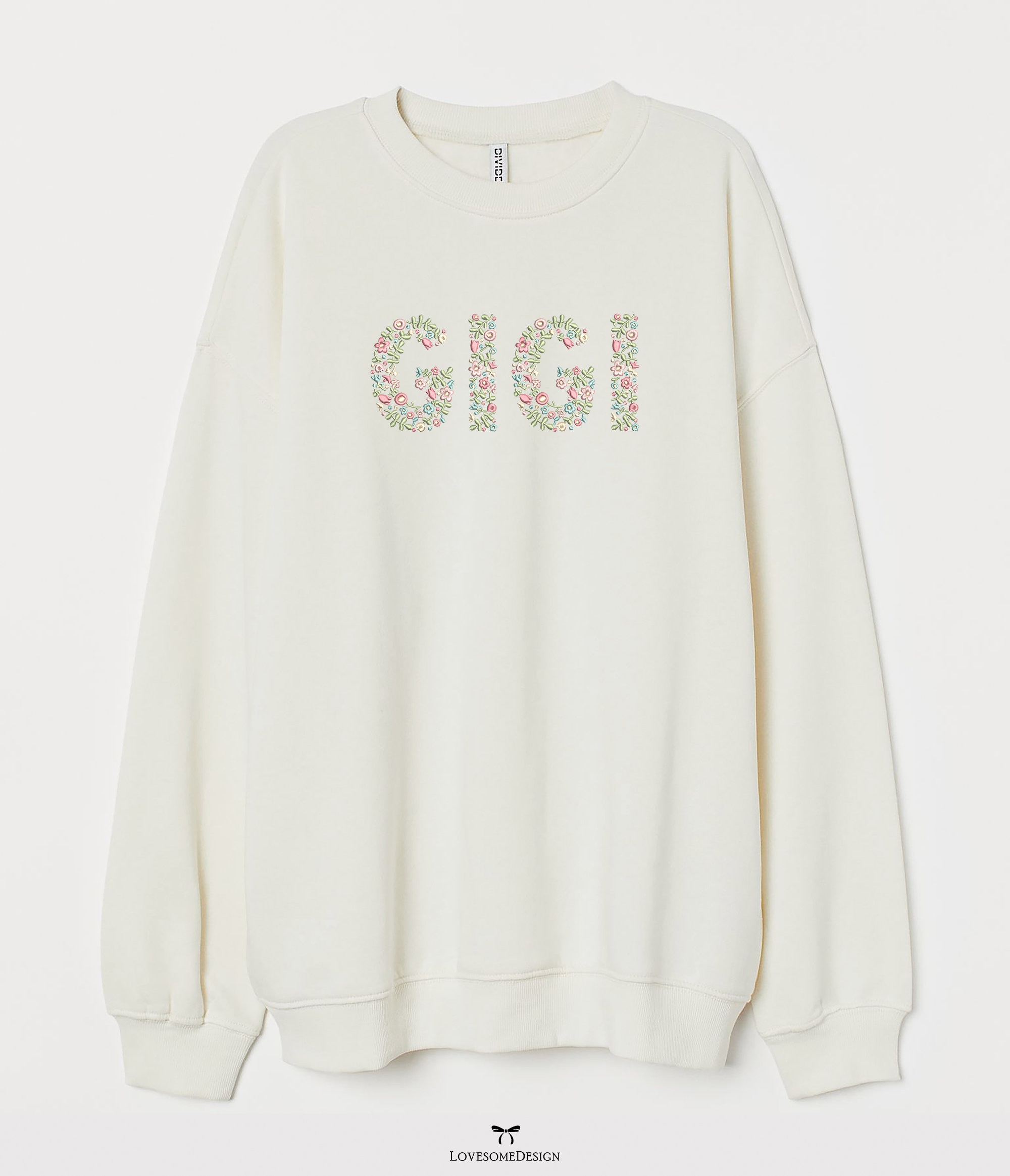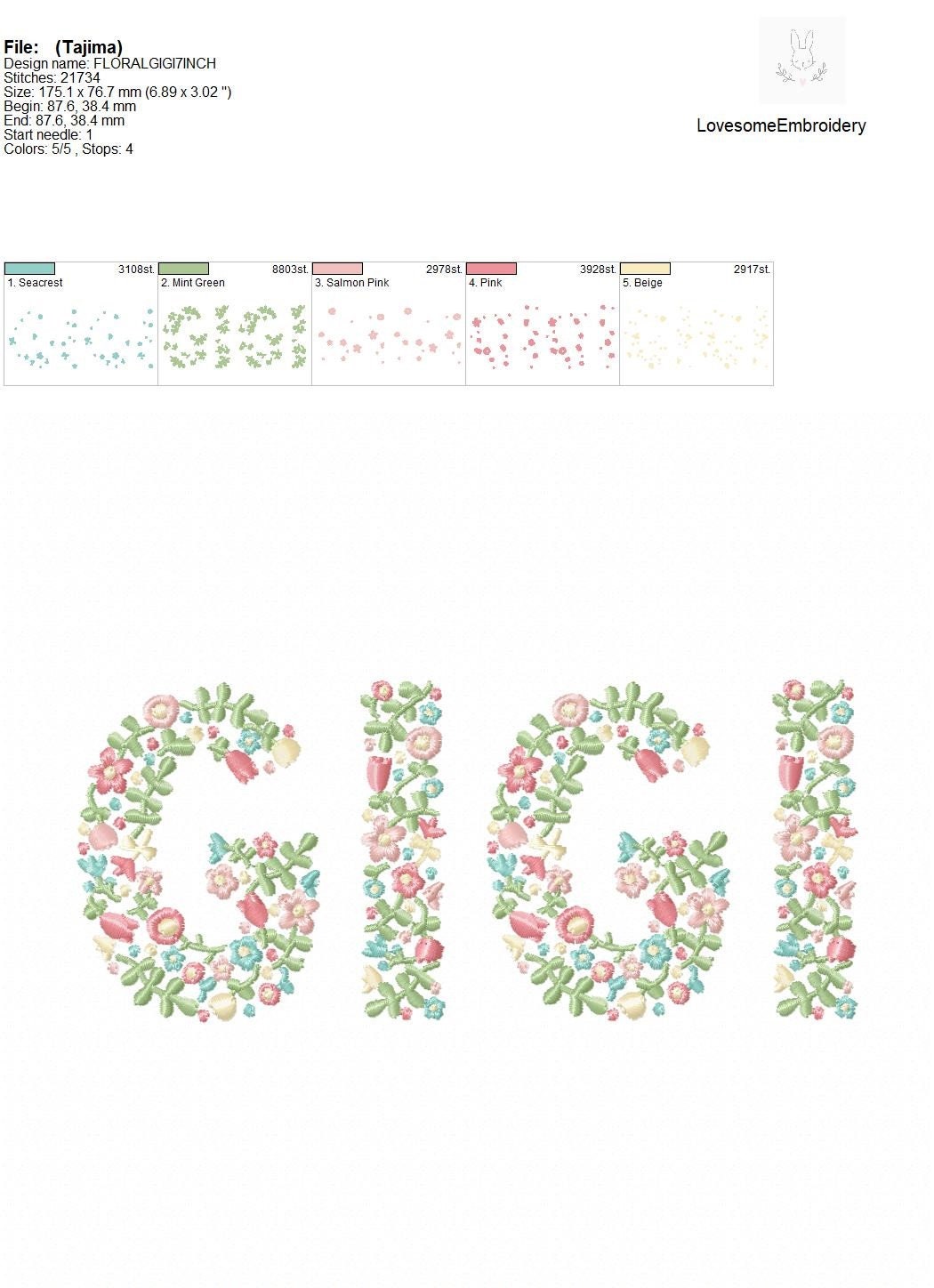This listing features a machine embroidery file of word "GIGI" which has a beautiful dainty floral fill design with pastel spring colors in 7inch size.