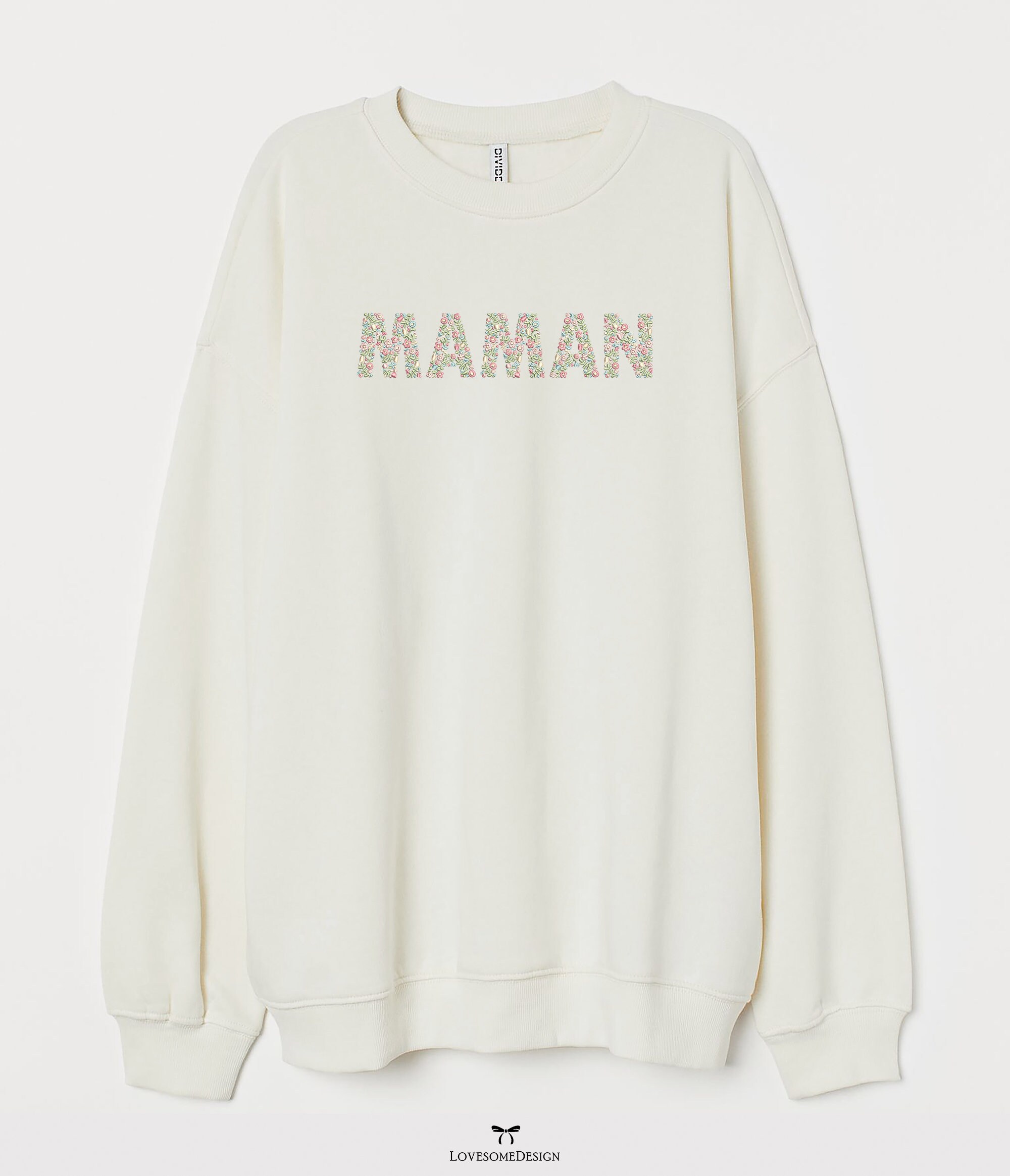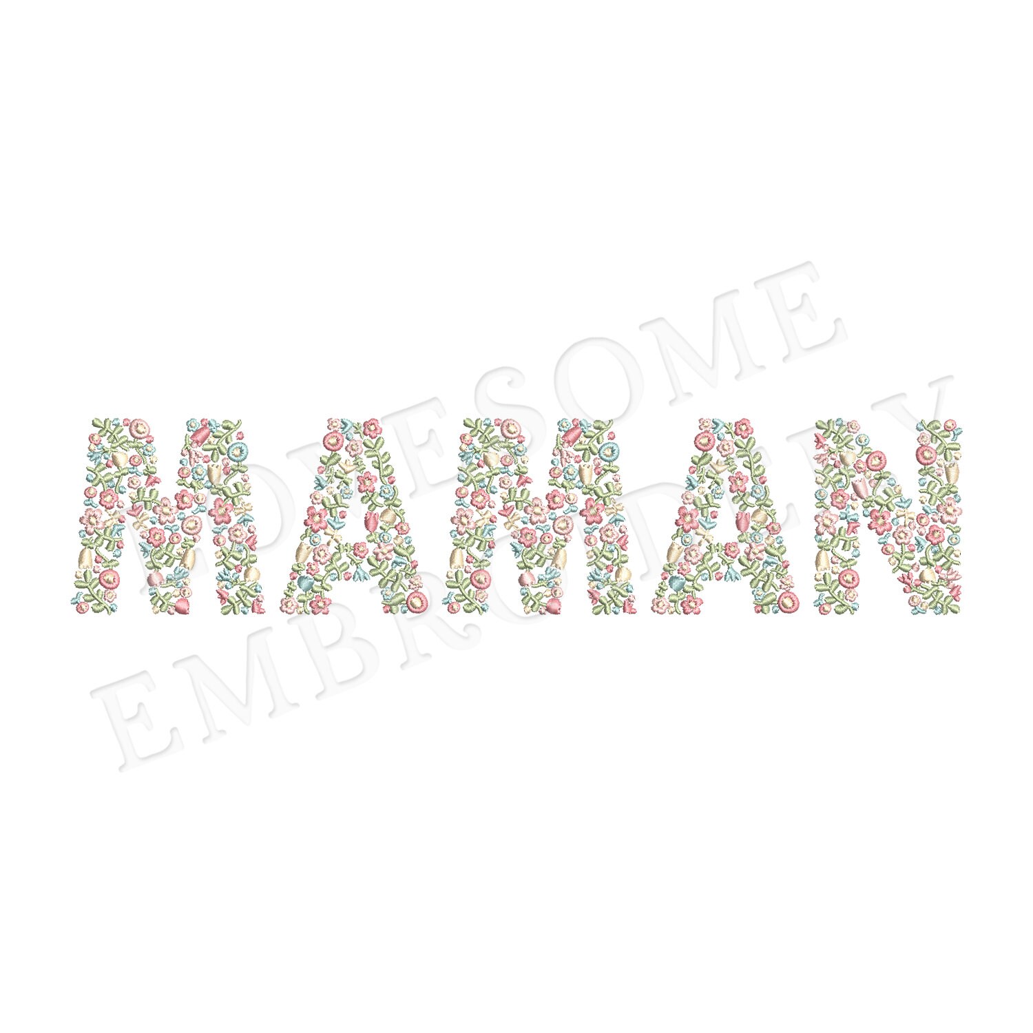This listing features a machine embroidery file of word "MAMAN" which has a beautiful dainty floral fill design with pastel spring colors in 7inch size.