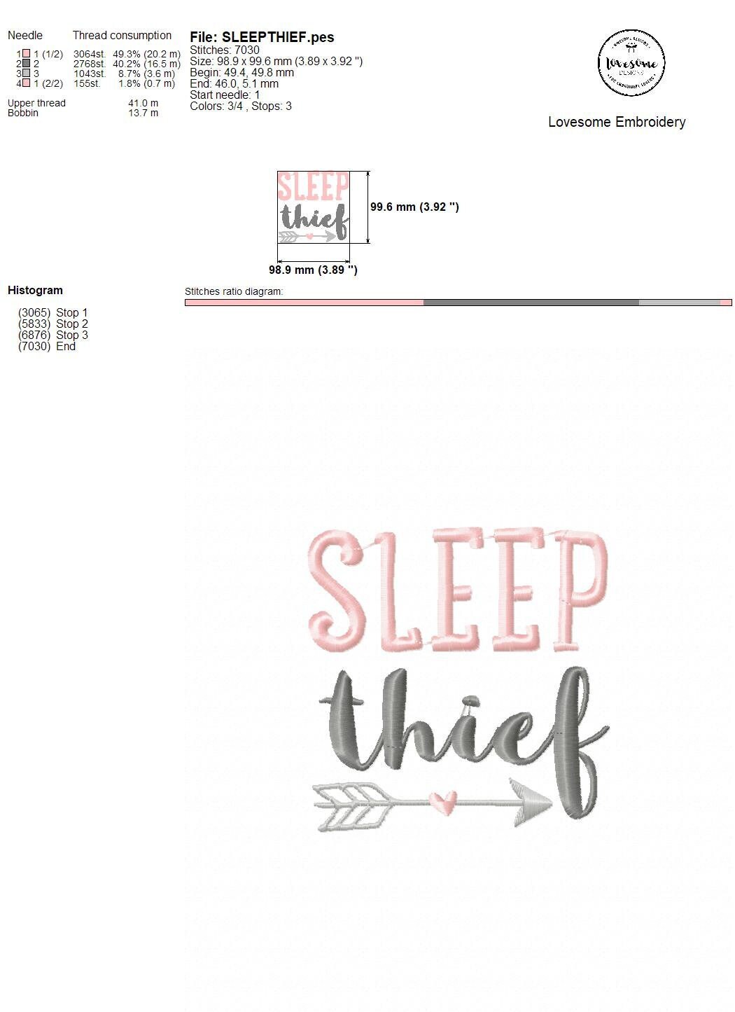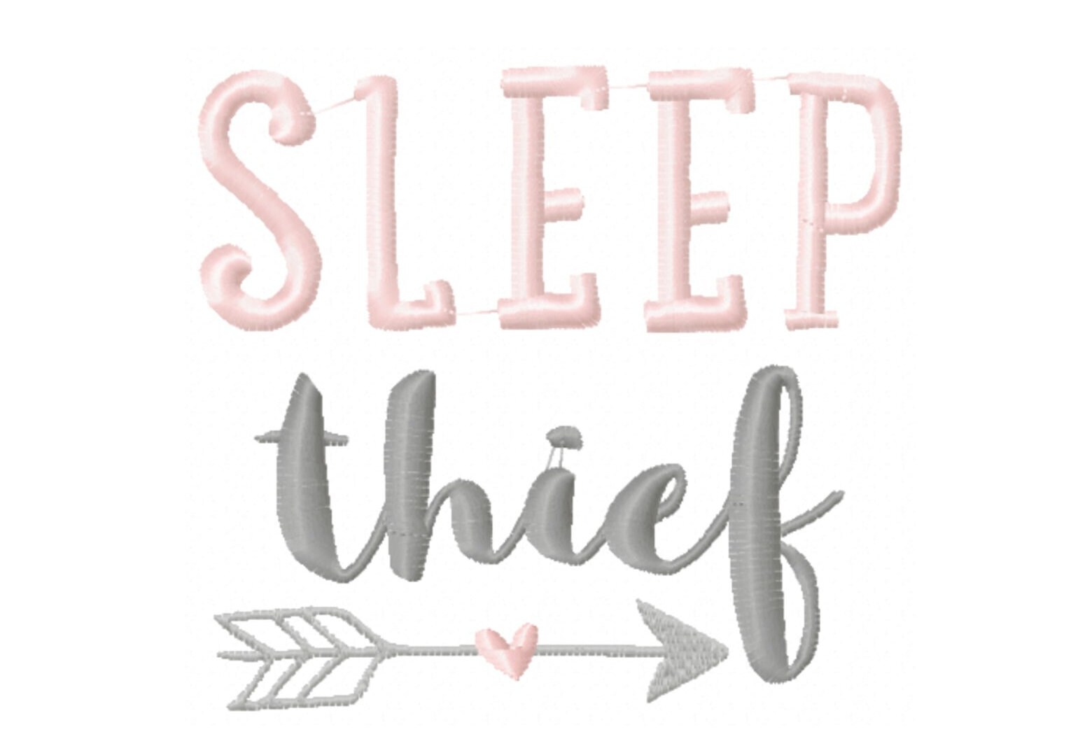 This listing features a machine embroidery file of Sleep Thief lettering. Designed with love for the first days of a newborn.
