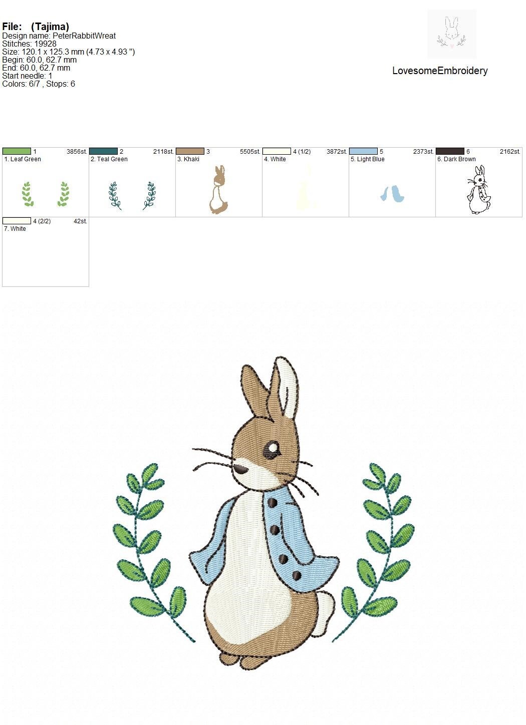 This listing features a machine embroidery file of Peter Rabbit in a wreath design in 5 inch size.