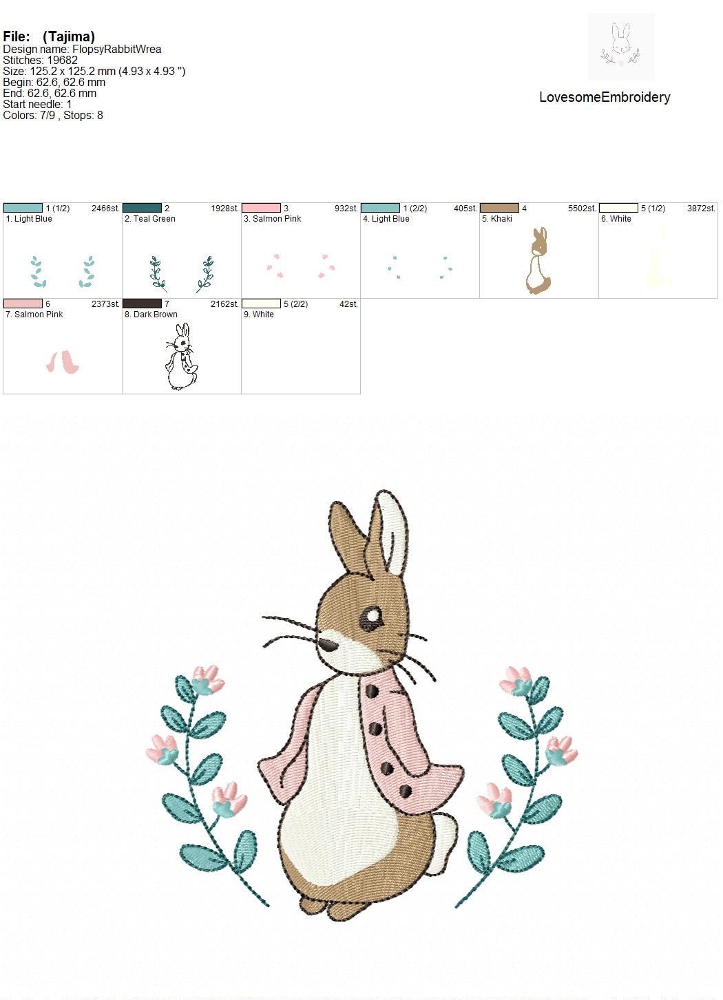 This listing features a machine embroidery file of Flopsy Rabbit in a wreath design in 5 inch size.