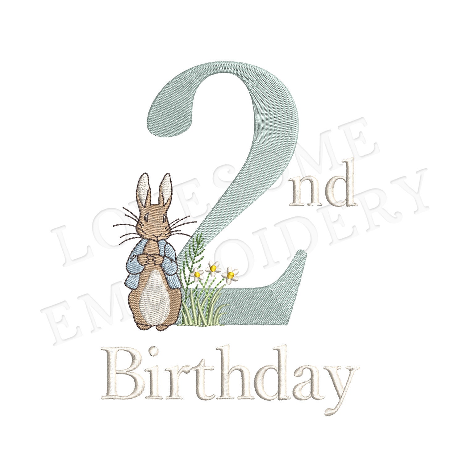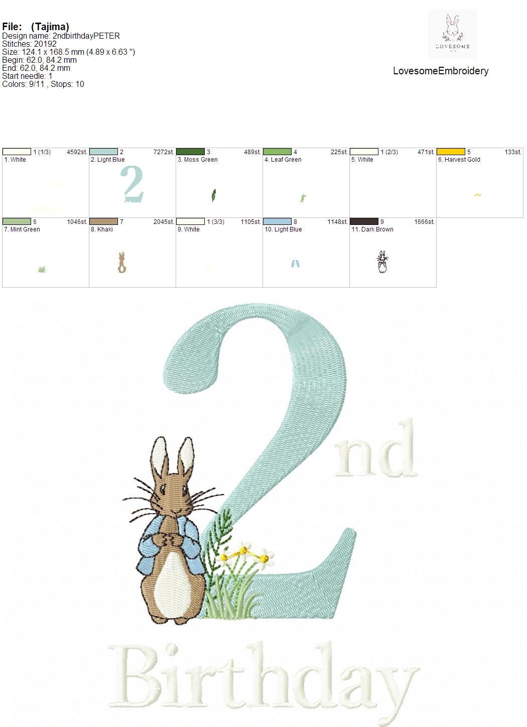 This listing features a machine embroidery file of Peter Rabbit Second Birthday design. Designed with love for the birthday of the little one.