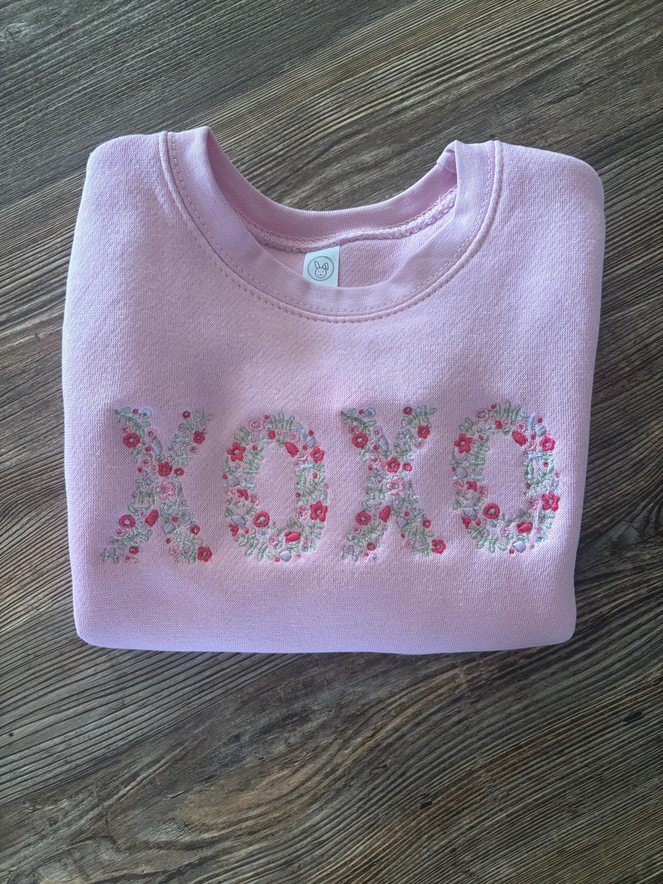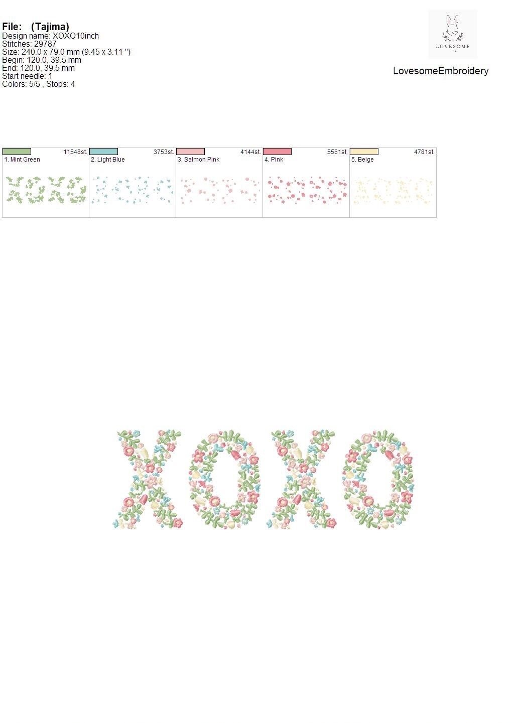 This listing features a machine embroidery file of word "XOXO" which has a beautiful dainty floral fill design with pastel spring colors in 10inch size.