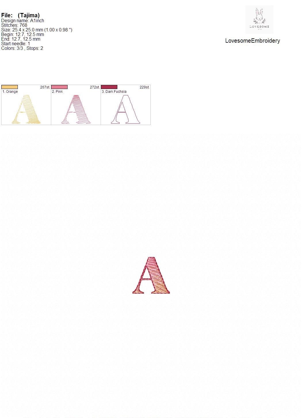 This listing features a machine embroidery font set which includes embroidery files of 26 uppercase monogram letters and and ampersand in 1inch size. (For the whole set, pls see the listing images.)