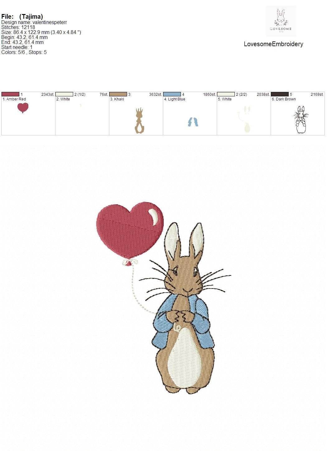 This listing features a machine embroidery file of Peter Rabbit holding a red heart balloon in hand in 5 inch size. Designed with love for the first Valentines Day of the little one.