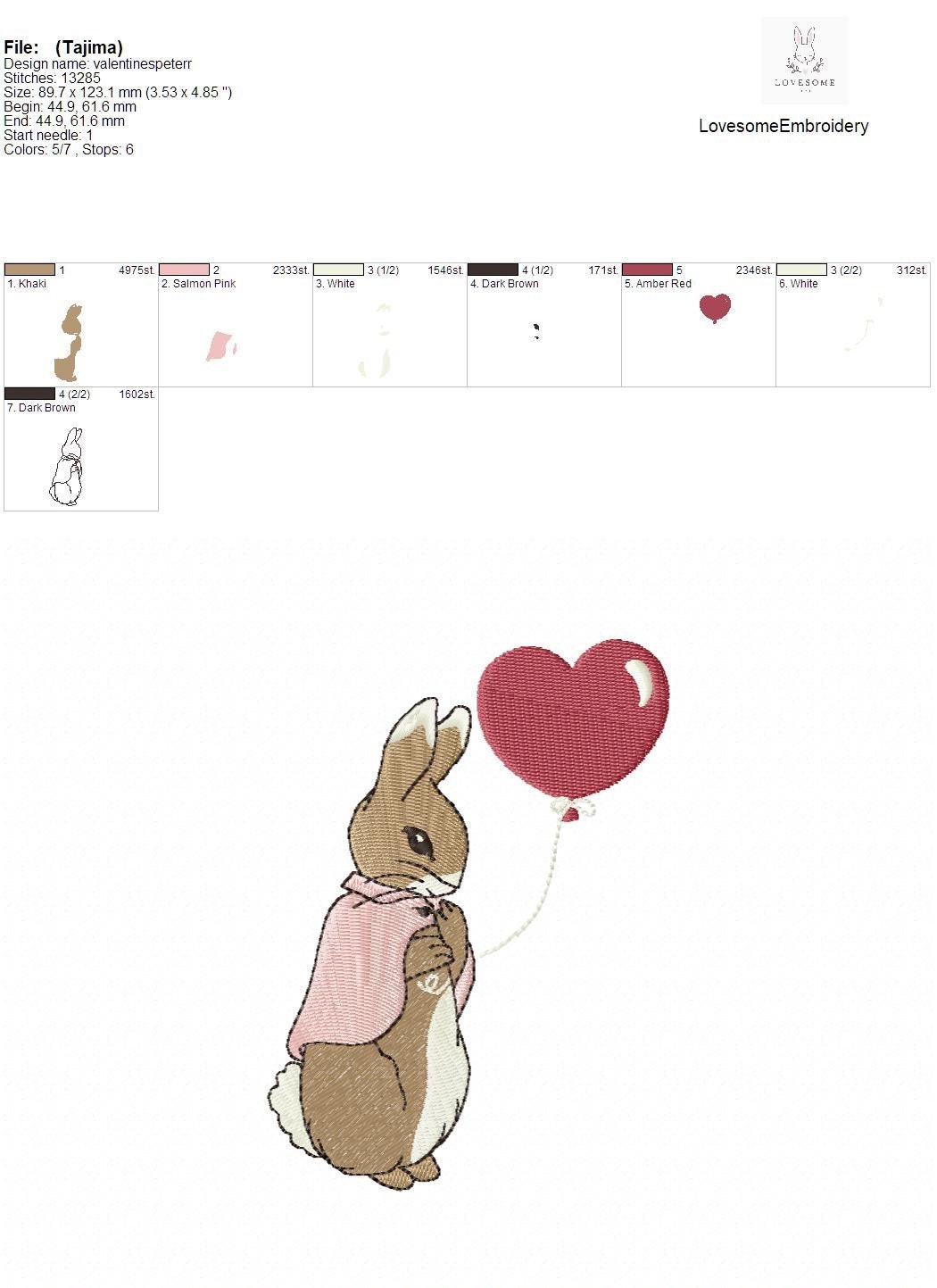 This listing features a machine embroidery file of Flopsy Rabbit holding a red heart balloon in hand in 5inch size. Designed with love for the first Valentines Day of the little one.