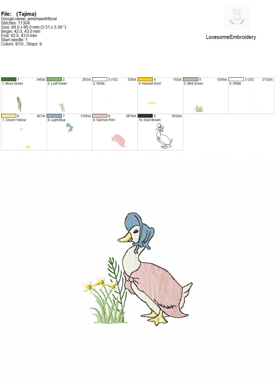 This listing features a machine embroidery file of Jemima Puddleduck with meadow florals design in 3.5 inch size.