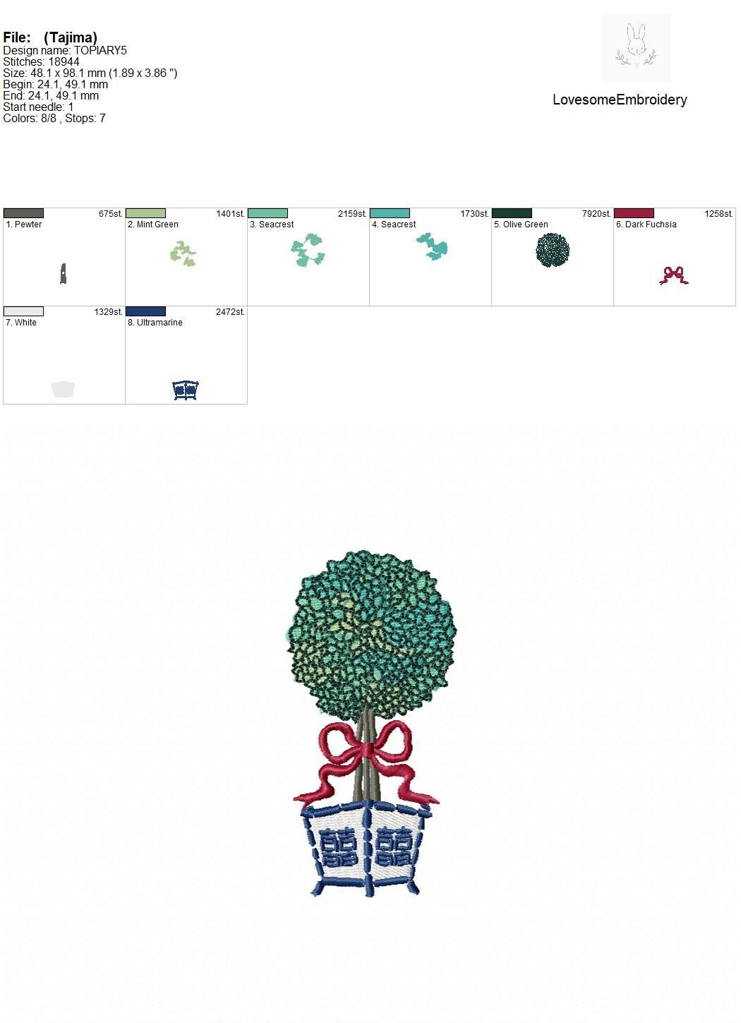 This listing features a machine embroidery file of Chinoiserie Chic Topiary with Red Bow in a Chinoisery Blue and White Bamboo Planter design in 4 inch size.