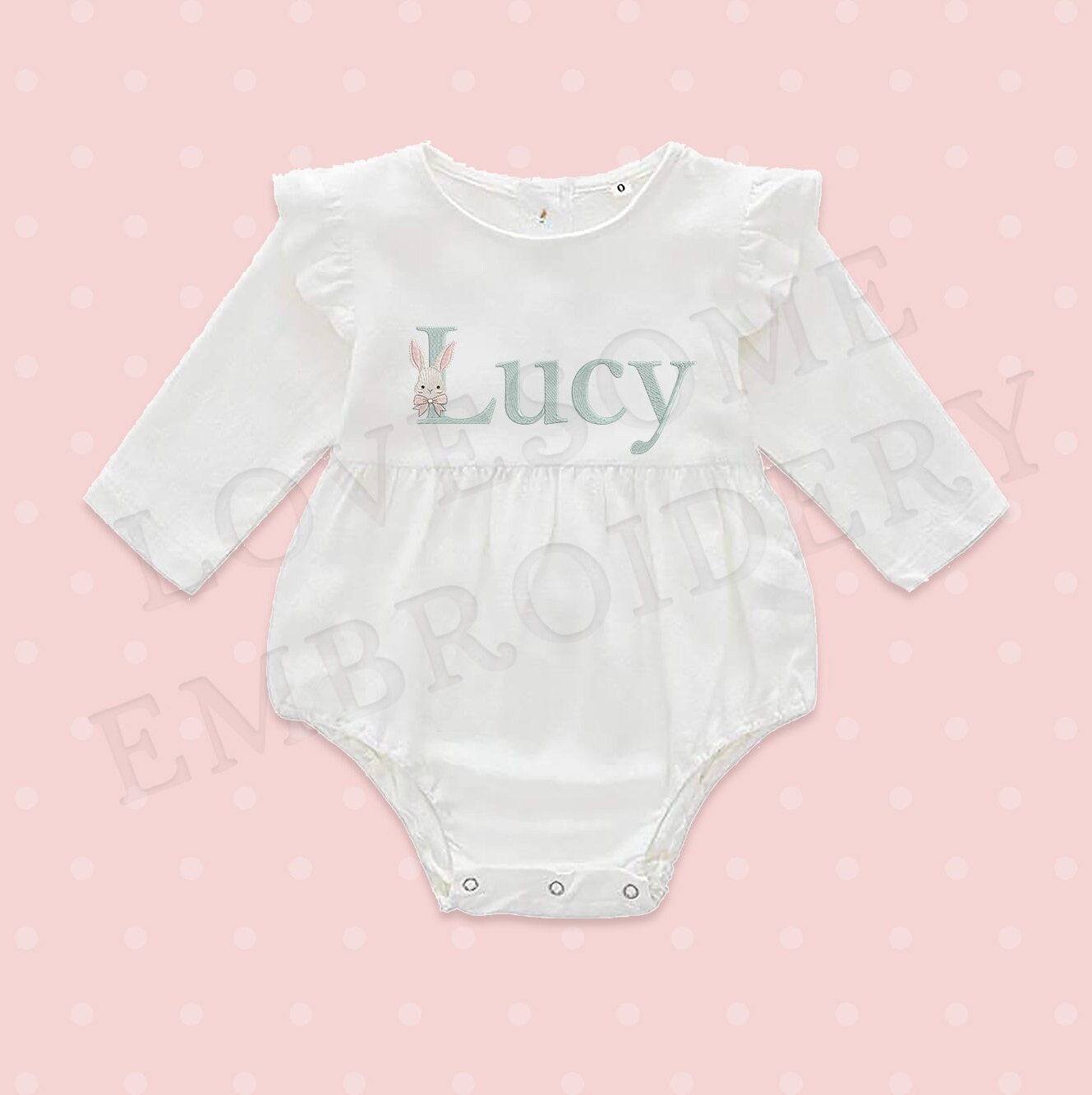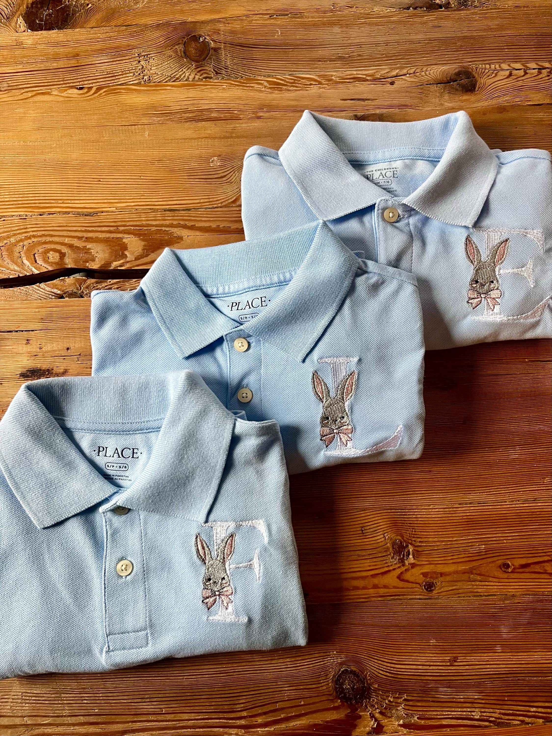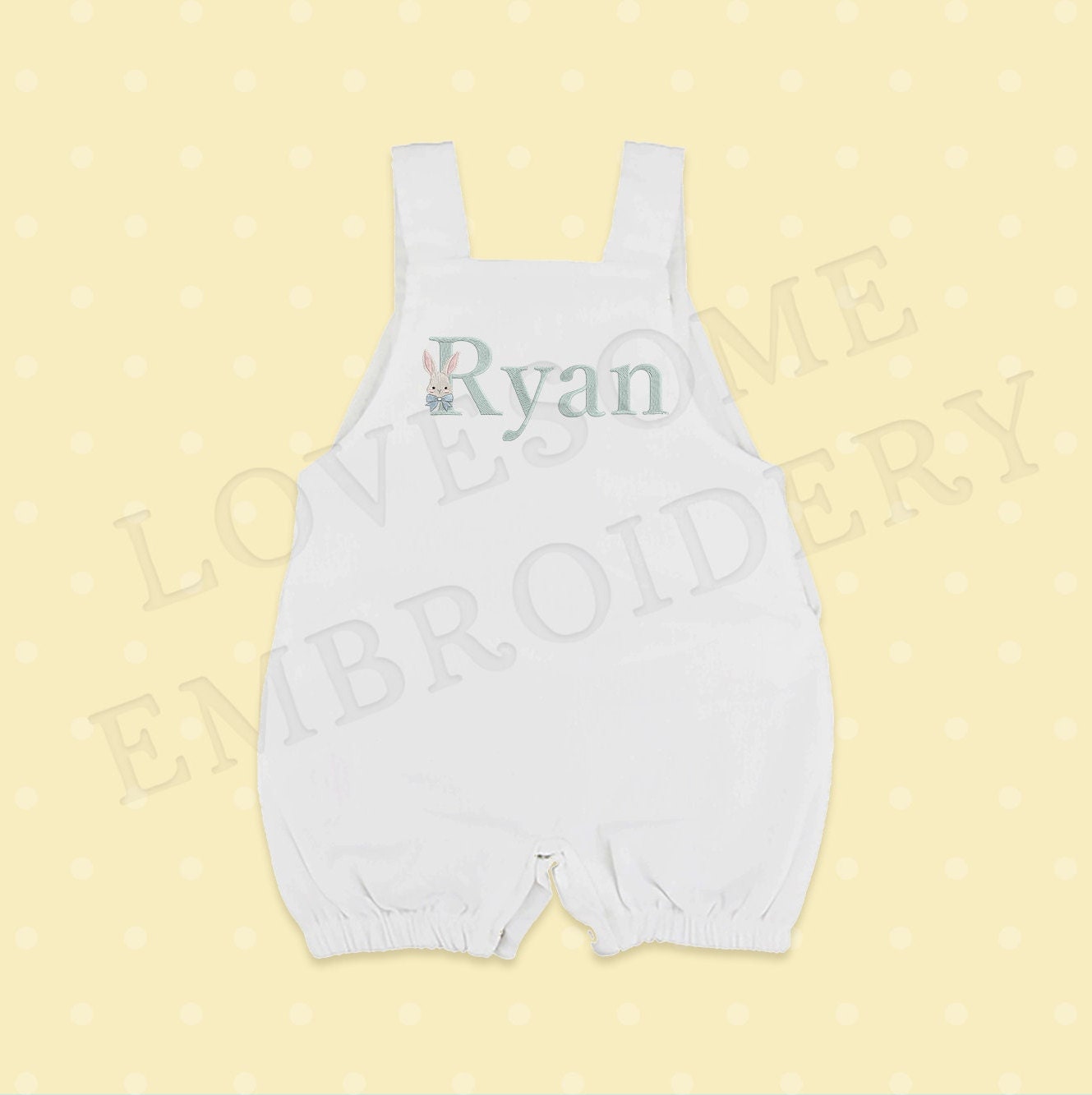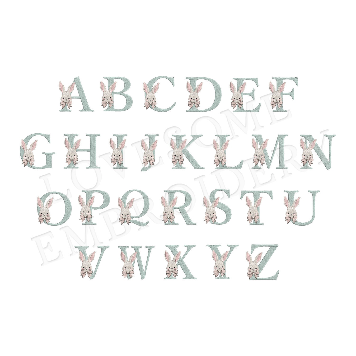 This listing features a machine embroidery font set which includes embroidery files of 26 uppercase monogram letters with easter bunny with a bow design in appr. 3inch size. (For the whole set, pls see the listing images.)
