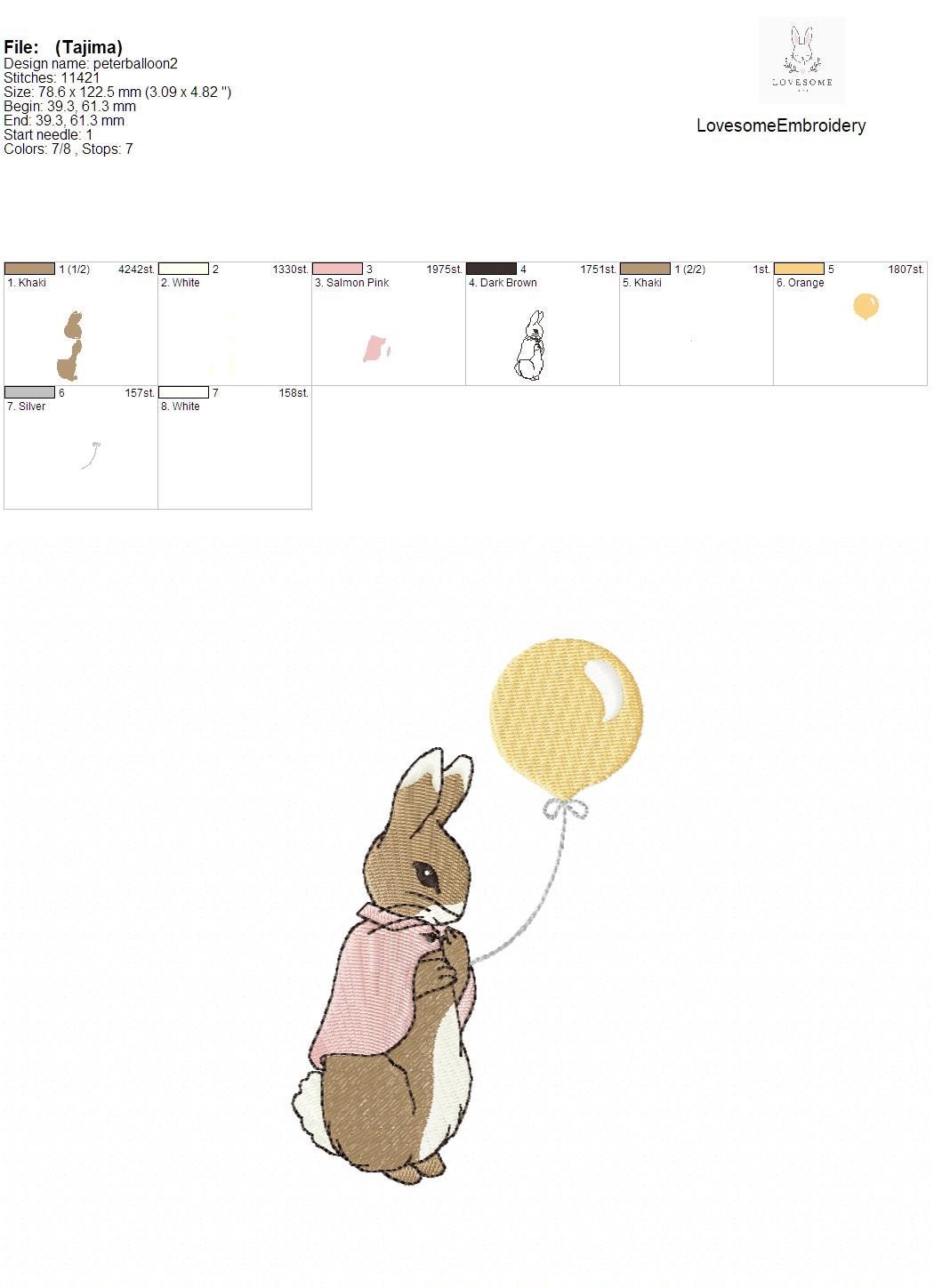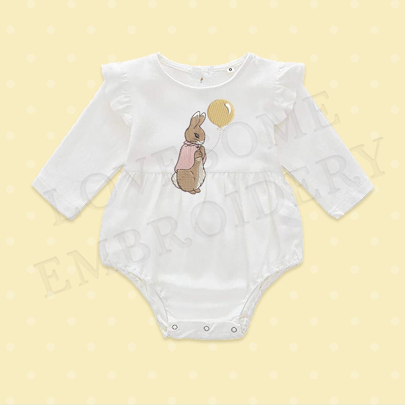 This listing features a machine embroidery file of Cottontail Rabbit holding a balloon in hand in 5inch size. Designed with love for the birthday of the little one.