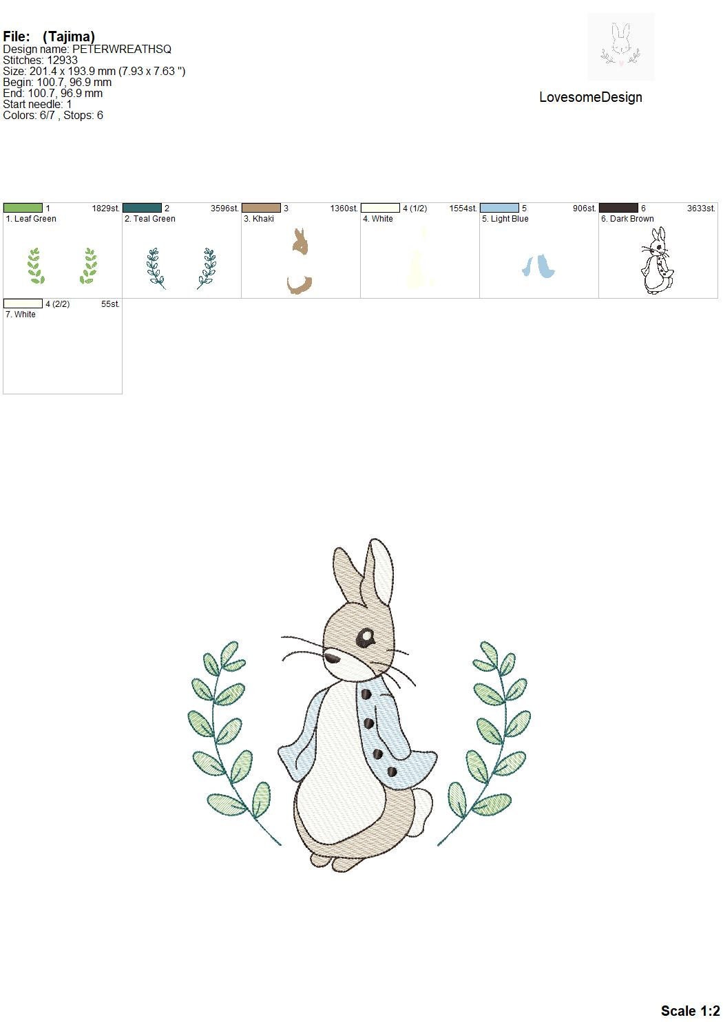This listing features a machine embroidery file of Peter Rabbit with a wreath design in quick stitch (aka sketch fill) in 8 inch size.