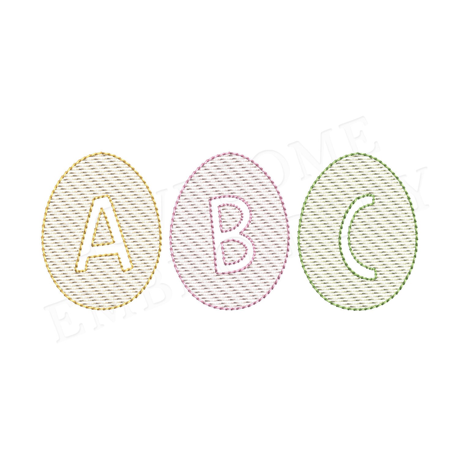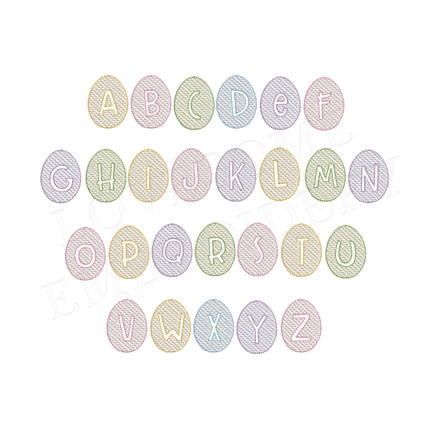 This listing features a machine embroidery font set which includes embroidery files of 26 uppercase monogram letters with cute easter egg design in quick stitch (aka sjetch fill) design and in 2inch size. (For the whole set, pls see the listing images.)