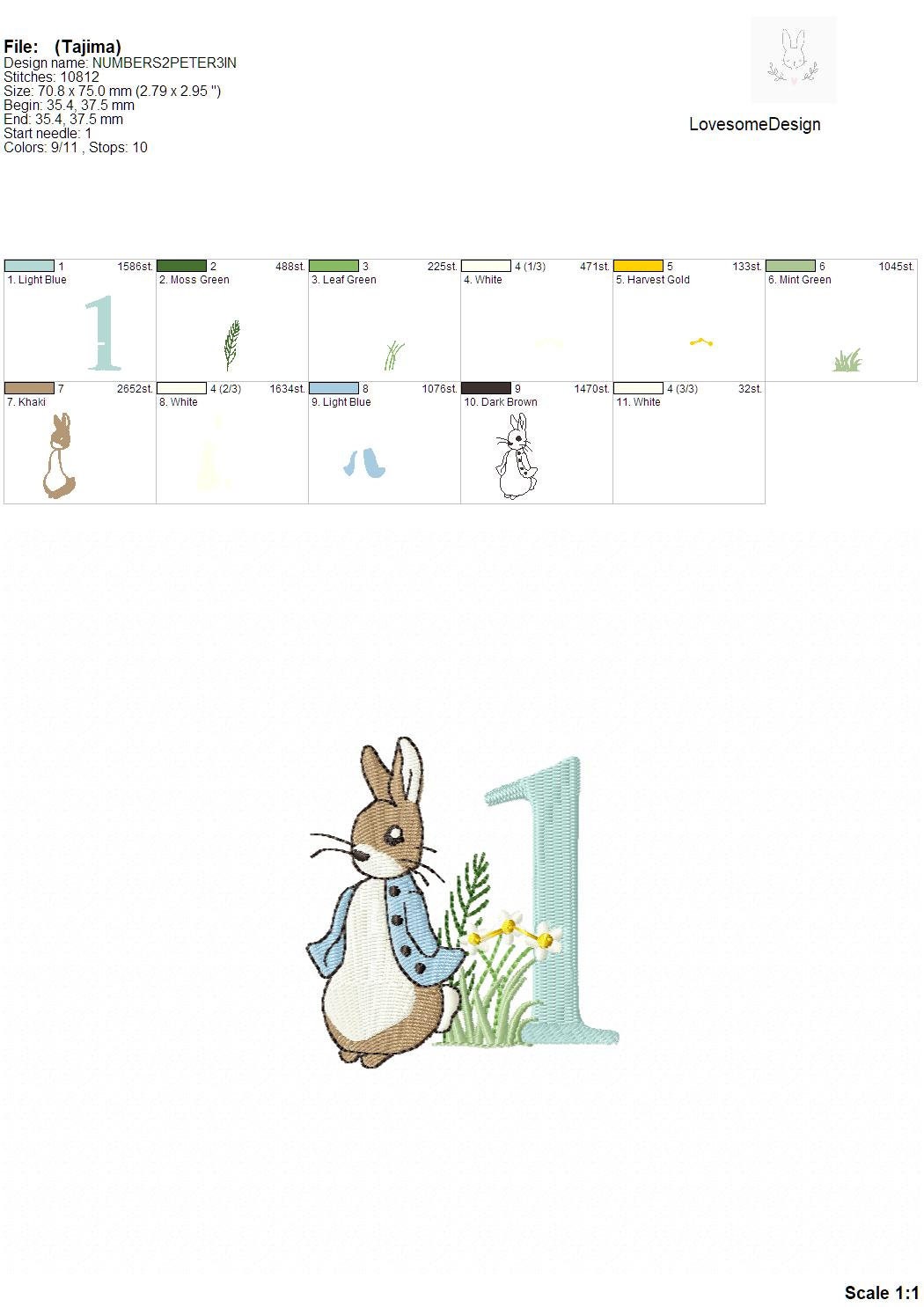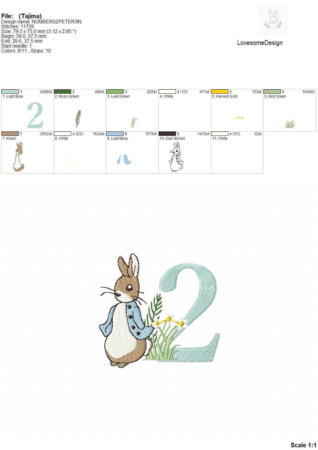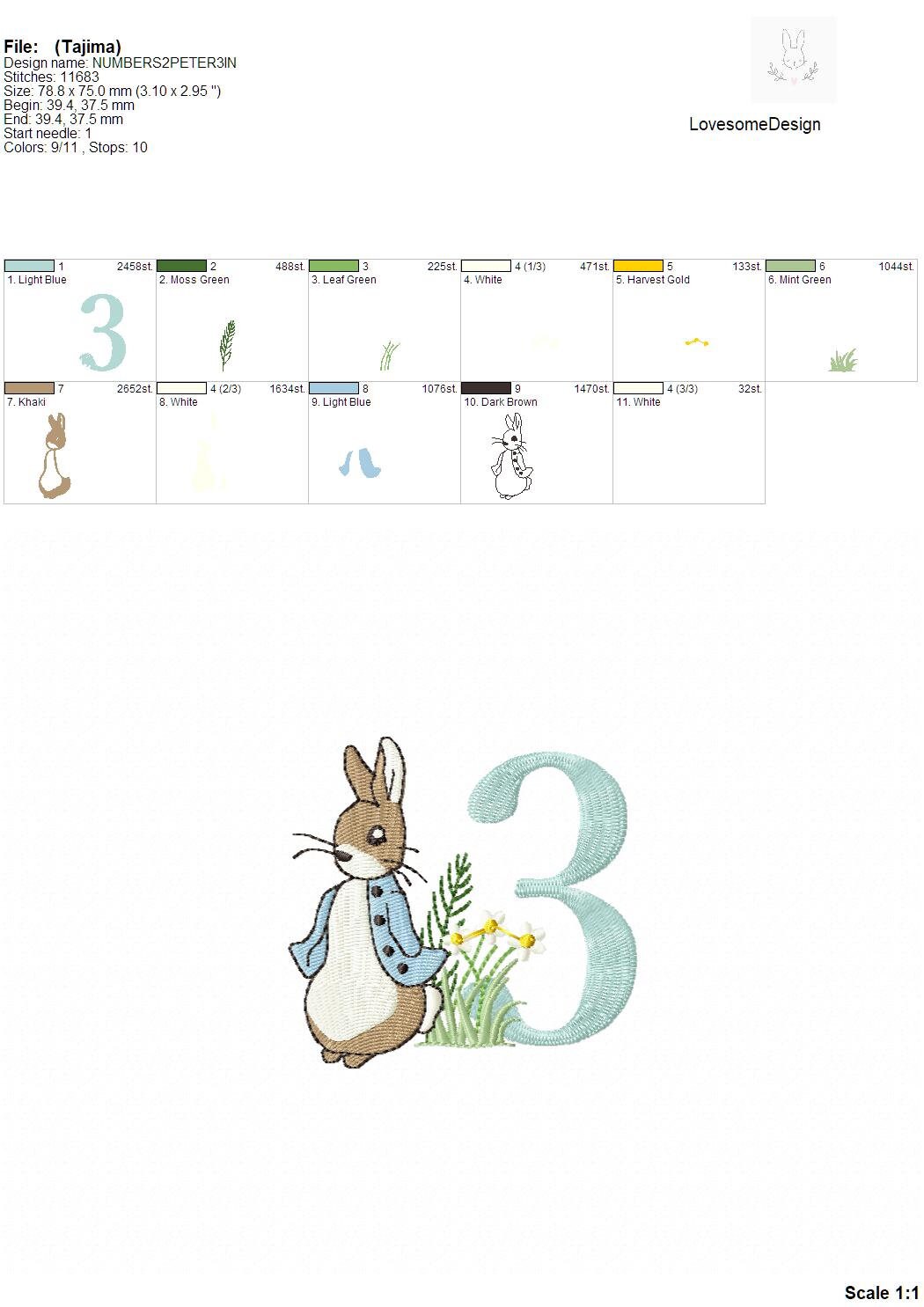 This listing features a machine embroidery numbers set which includes embroidery files of ten numbers (0-9) with Peter Rabbit design in 3inch size for 4x4 hoops for machine embroidery. (For the whole set, pls see the listing images.)