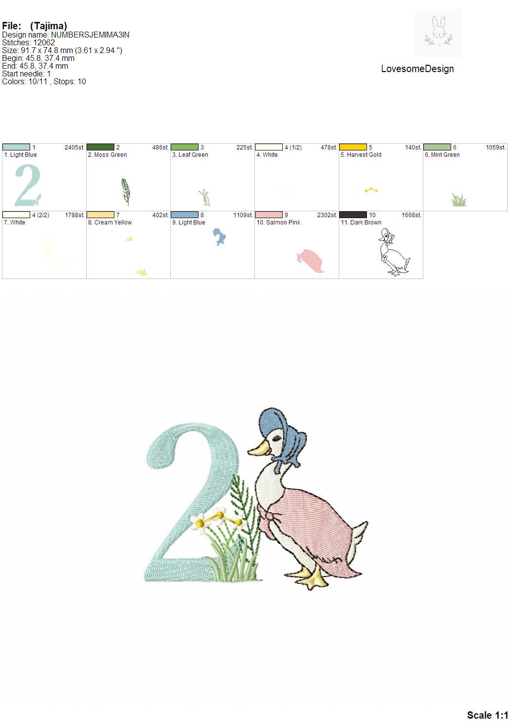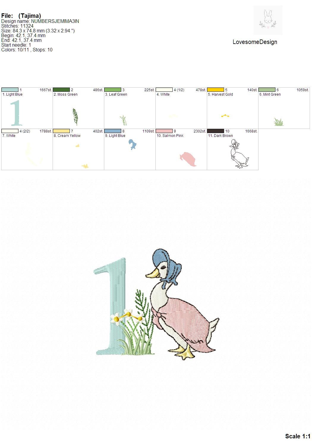 This listing features a machine embroidery numbers set which includes embroidery files of ten numbers (0-9) with Jemima Puddleduck design in 3inch size for 4x4 hoops for machine embroidery. (For the whole set, pls see the listing images.)