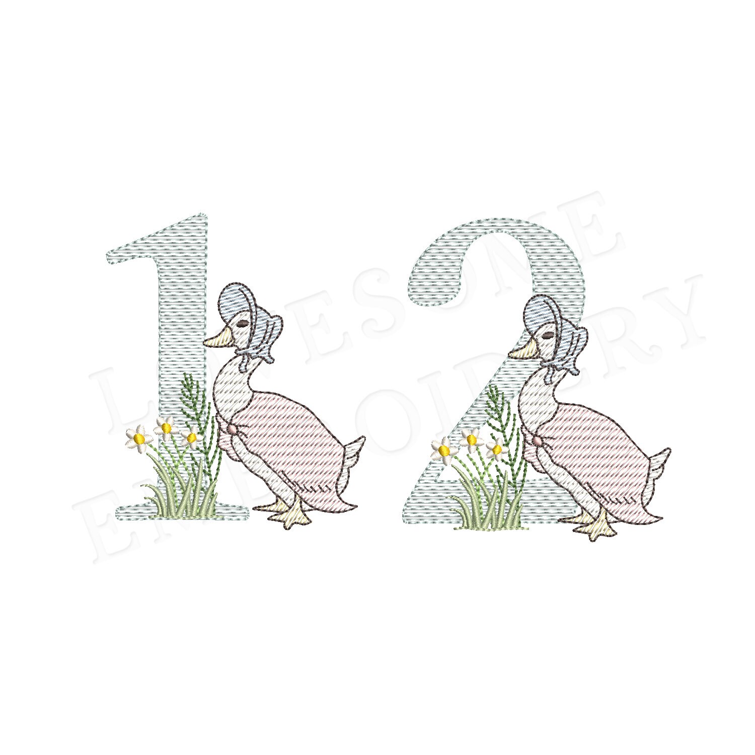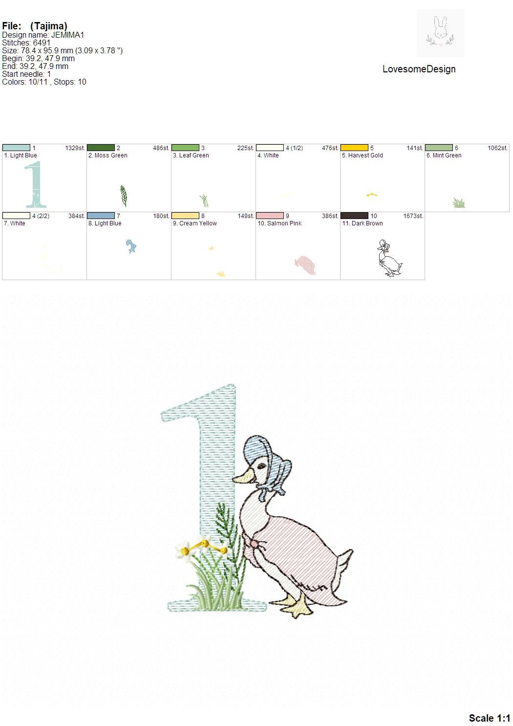 This listing features a machine embroidery numbers set which includes embroidery files of ten numbers (0-9) with Jemima Puddleduck design in 4inch size all in quick stitch (aka sketch fill) for 4x4 hoops for machine embroidery. (For the whole set, pls see the listing images.)
