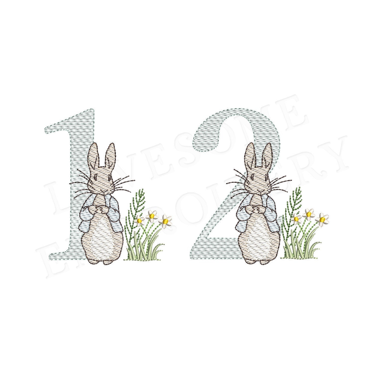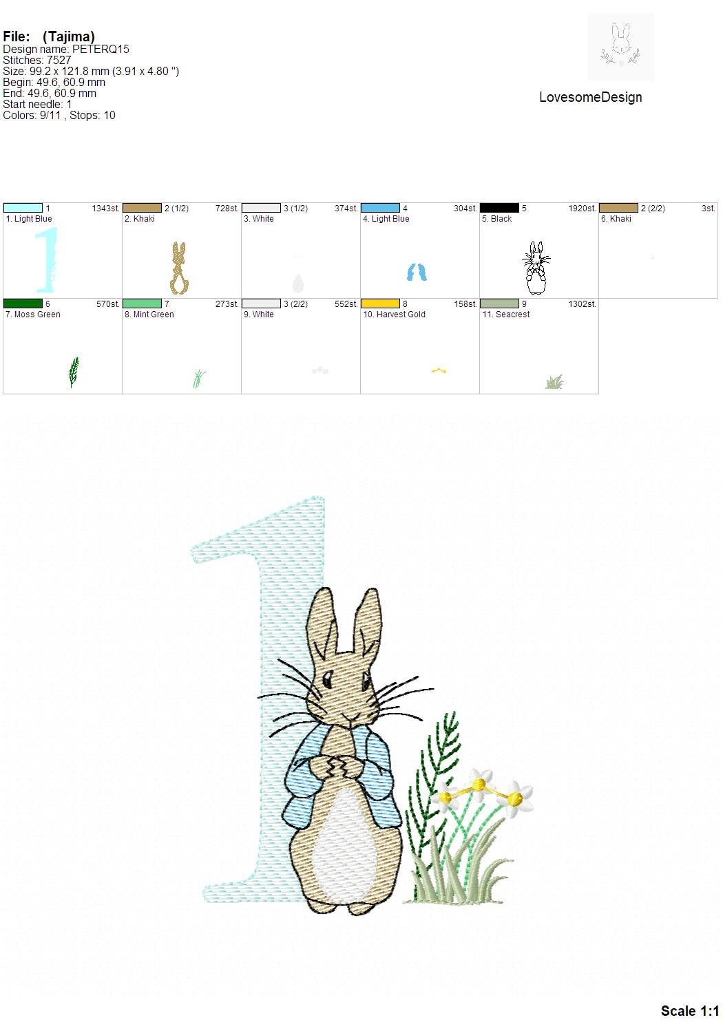 This listing features a machine embroidery numbers set which includes embroidery files of ten numbers (0-9) with Peter Rabbit design in 5inch size all in quick stitch (aka sketch fill) for 5x7 hoops for machine embroidery. (For the whole set, pls see the listing images.)